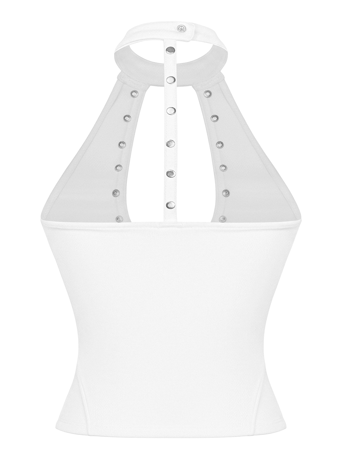 Khoét ngực sâu tinh tế, kết hợp cùng đinh tán dọc thân áo, mang lại sự cuốn hút, hiện đại và vô cùng gợi cảm. Tiện lợi hơn với thiết kế cổ gài nút bấm, dễ dàng điều chỉnh.