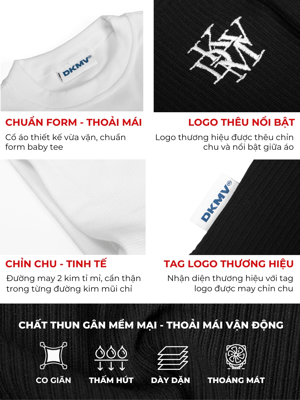 DKMV muốn đem tới cho khách hàng một trải nghiệm thoải mái và tự tin khi diện item ôm dáng nên đã lựa chọn chất liệu vải thun gân co giãn đẻ sản xuất. chất vải dày dặn nhưng vẫn giữ được độ thông thoáng.