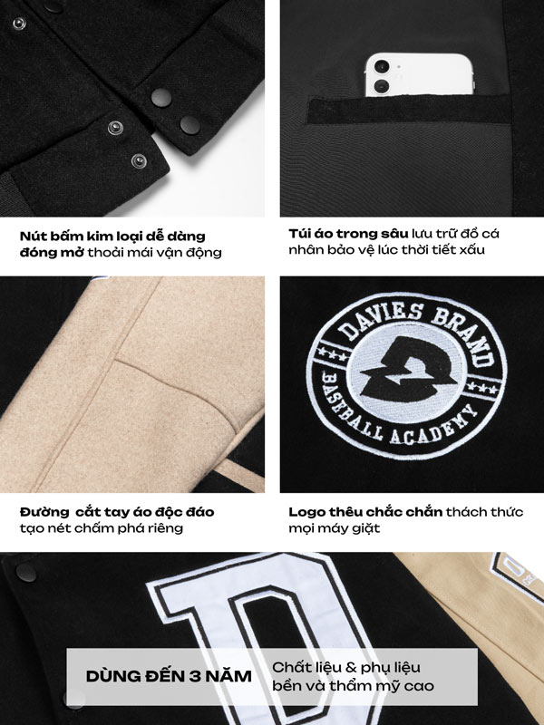 Áo khoác bóng chày local brand Davies Varsity Baseball Academy sở hữu độ bền cao