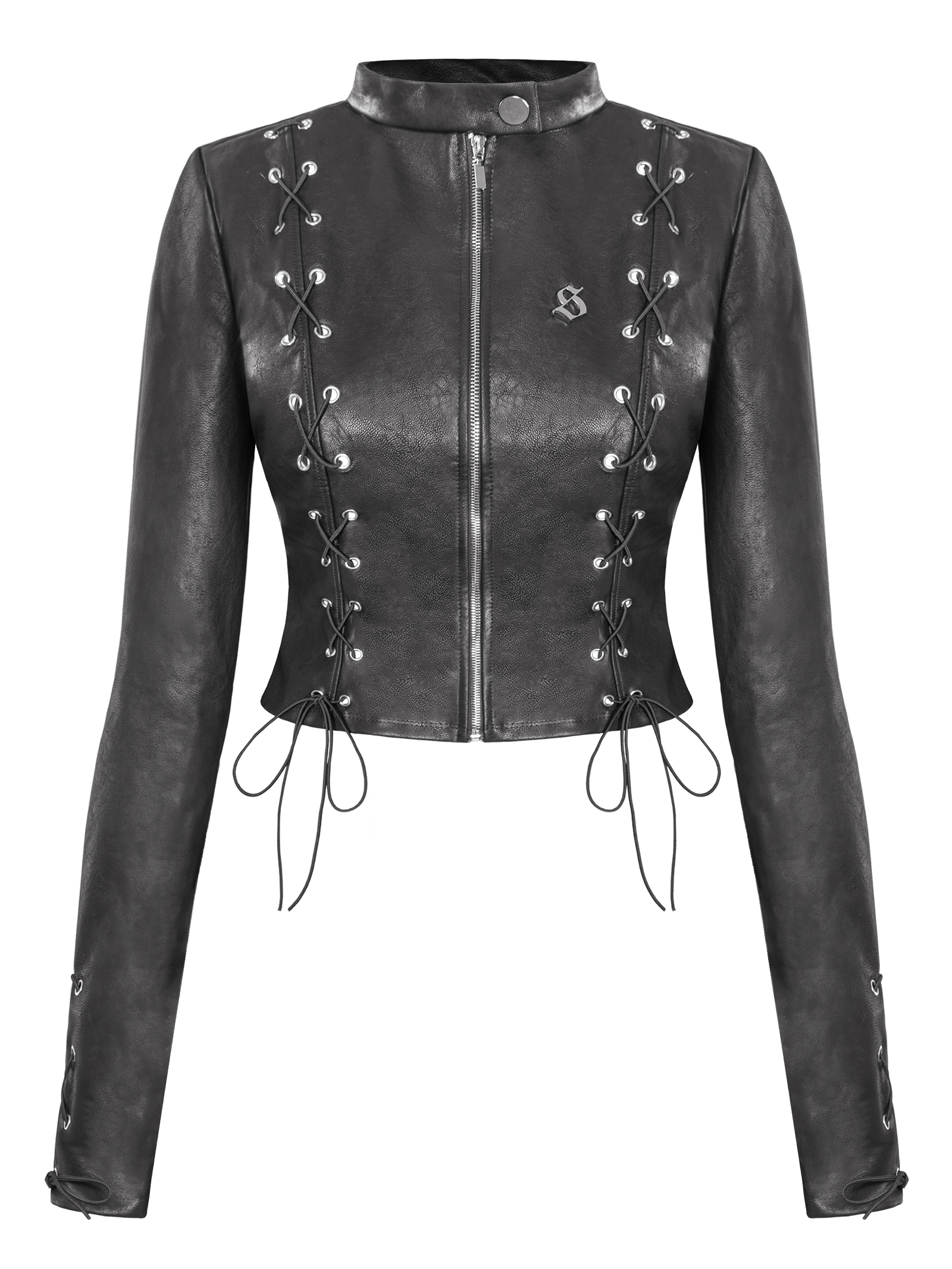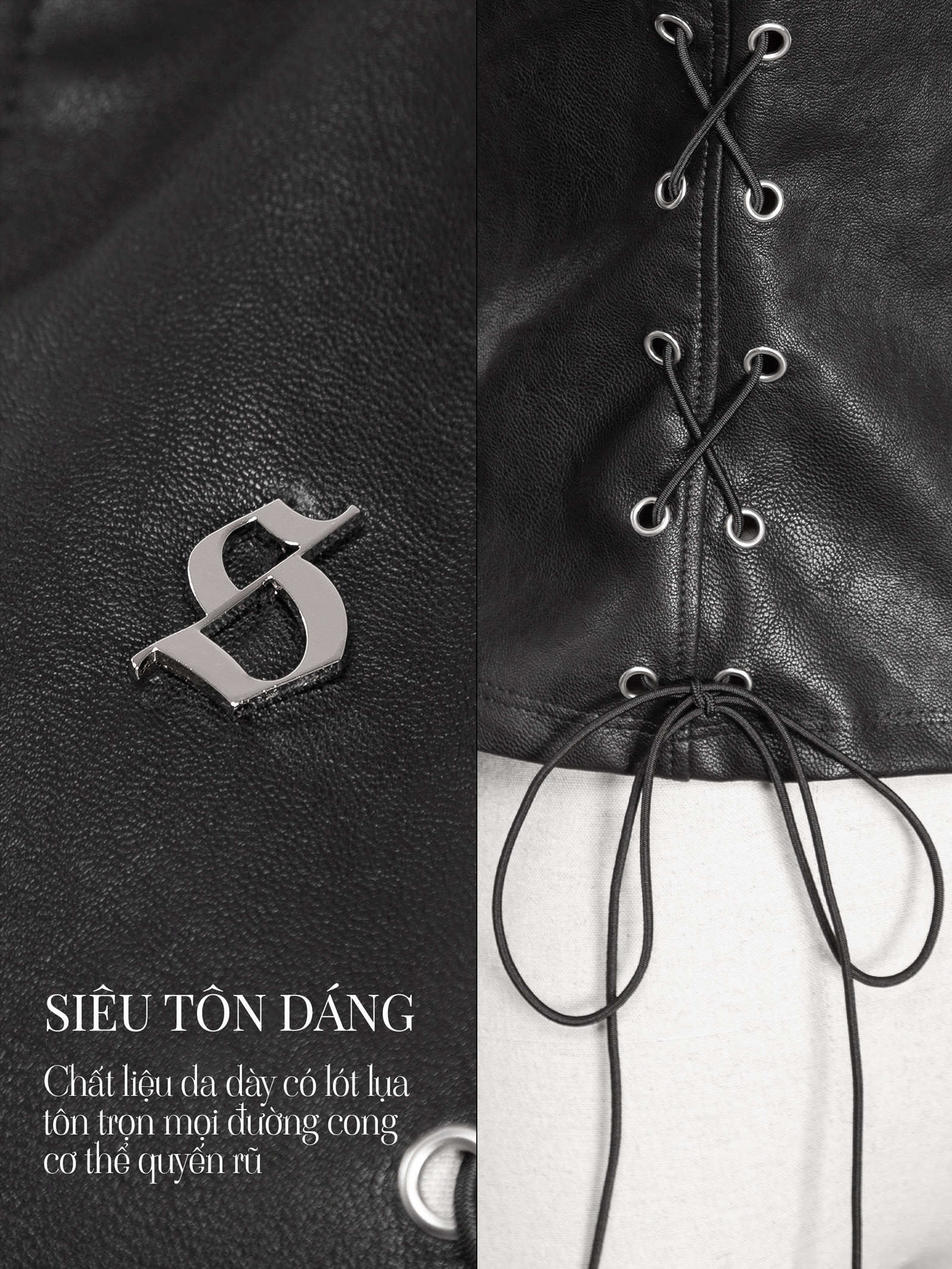 Điểm nhấn nằm ở chi tiết đóng mắt cáo đan dây dọc hai bên thân áo và cuối tay áo, mang đậm hơi thở thời trang biker rock chic. Logo inox chữ S độc quyền được đặt tinh tế, khẳng định thương hiệu.