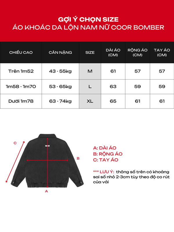 Thông tin size ( kích cỡ ) áo khoác da lộn nam nữ Coor Bomber Jacket