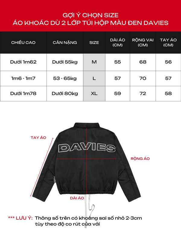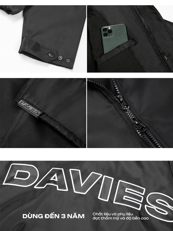 Davies luôn hướng đến sự phát triển và cải tiến vì thế đội ngũ team Davies đã tạo nên áo khoác dù với form áo basic phù hợp với mọi phong cách và dáng người. Davies tỉ mỉ từ logo thương hiệu thêu đến logo tag inox mang lại hình ảnh đơn giản nhưng cá tính mang hơi hướng streetstyles