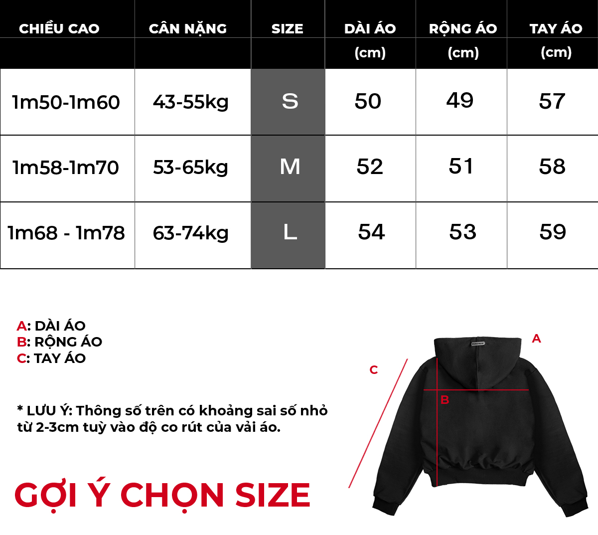 Kích thước áo khoác tiêu chuẩn phù hợp với hầu hết dáng người mang. Tham khảo chi tiết bên dưới nha