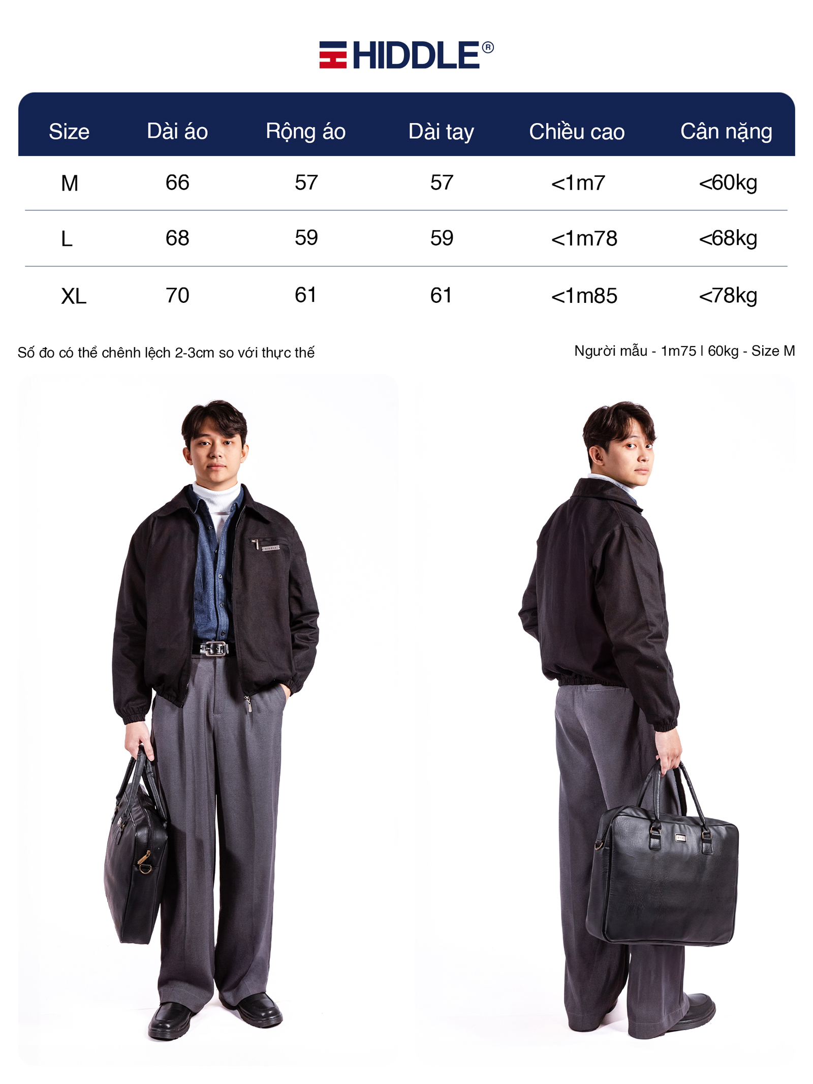 Bảng size áo khoác nam kaki 2 lớp cao cấp HIDDLE:
