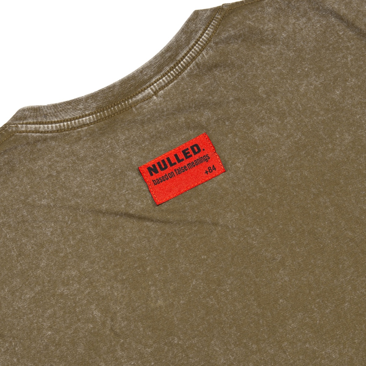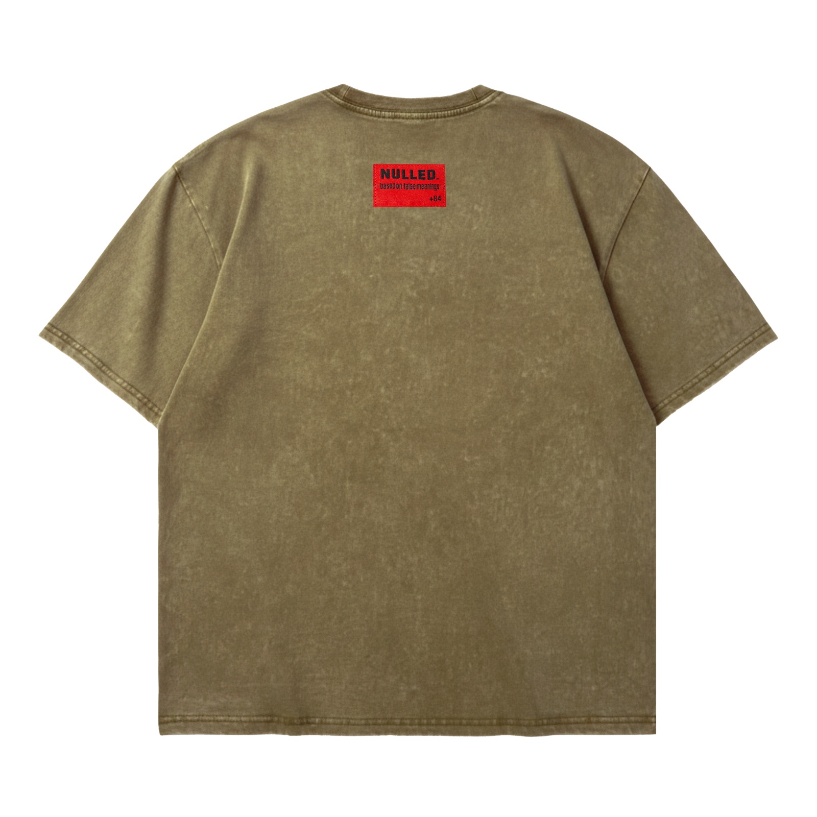 Điểm nhấn đặc biệt của thiết kế là tag đỏ sau gáy, một chi tiết nhận diện thương hiệu tinh tế nhưng vô cùng nổi bật, khẳng định giá trị và sự khác biệt của dòng Áo phông vải wash loang màu nâu đậm NULLED so với các sản phẩm đại trà khác.