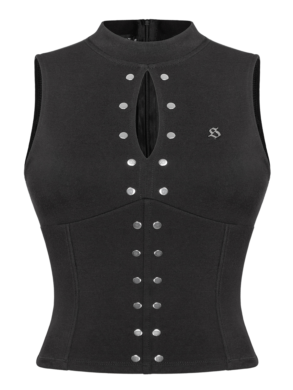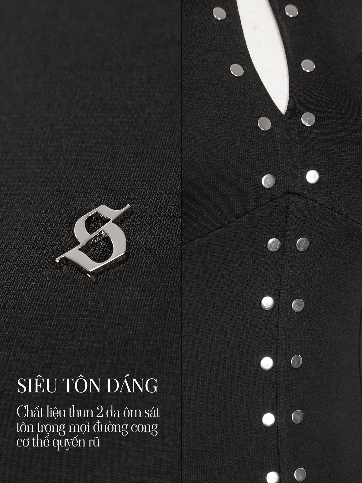Điểm nhấn táo bạo với chi tiết khoét giữa ngực gợi cảm và hàng đinh tán kim loại lấp lánh dọc thân, tạo hiệu ứng "Sparkle" cuốn hút, khẳng định phong cách nổi trội giữa đám đông.