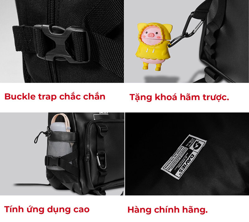 Bên cạnh đó các vị trị cố định được dùng với độ bền cao như buckle strap hay khóa kéo.