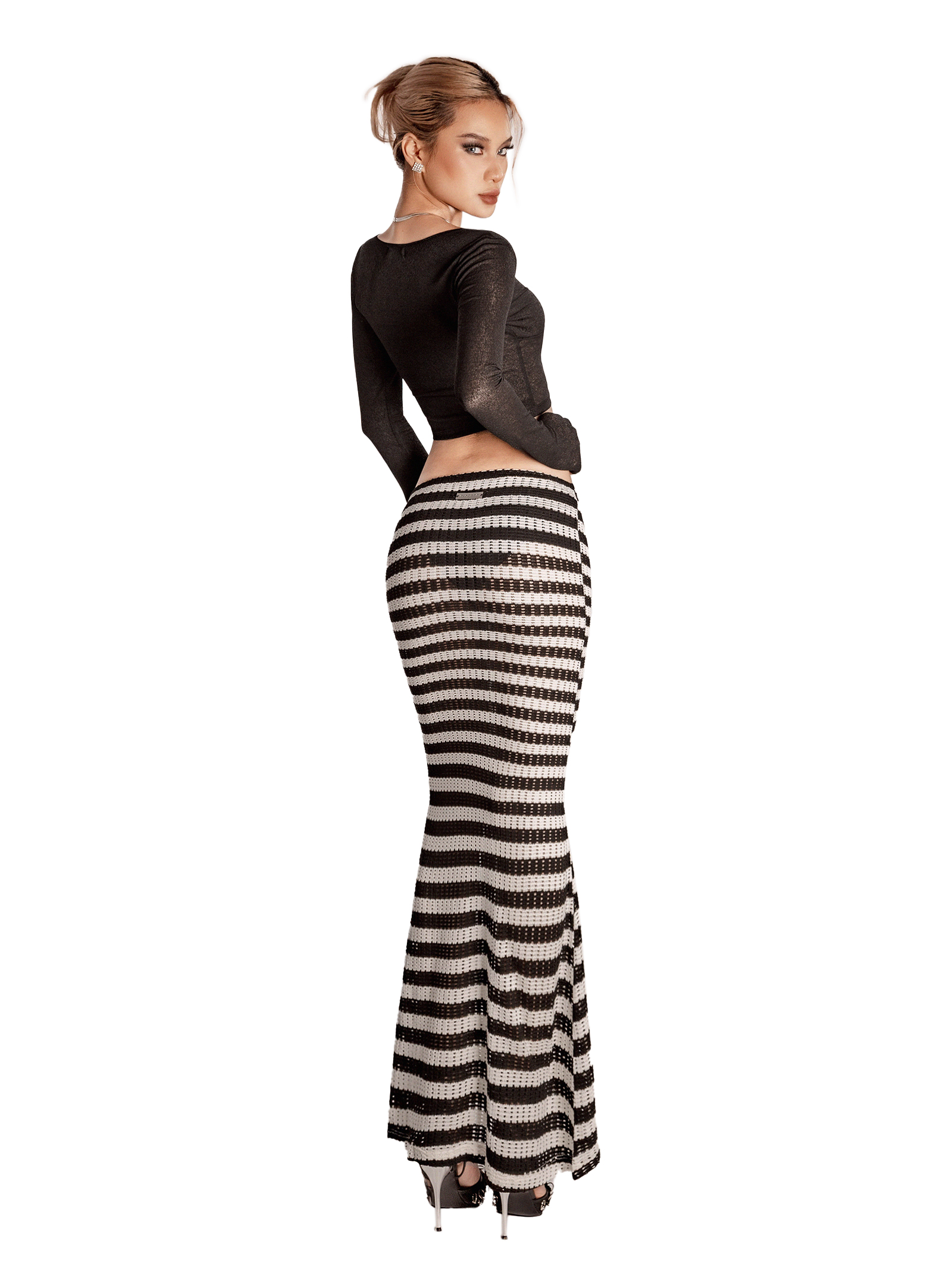 Chân váy dáng dài ôm sát cơ thể kết hợp cùng thiết kế cạp thấp hiện đại, giúp khoe vòng eo và hông quyến rũ.