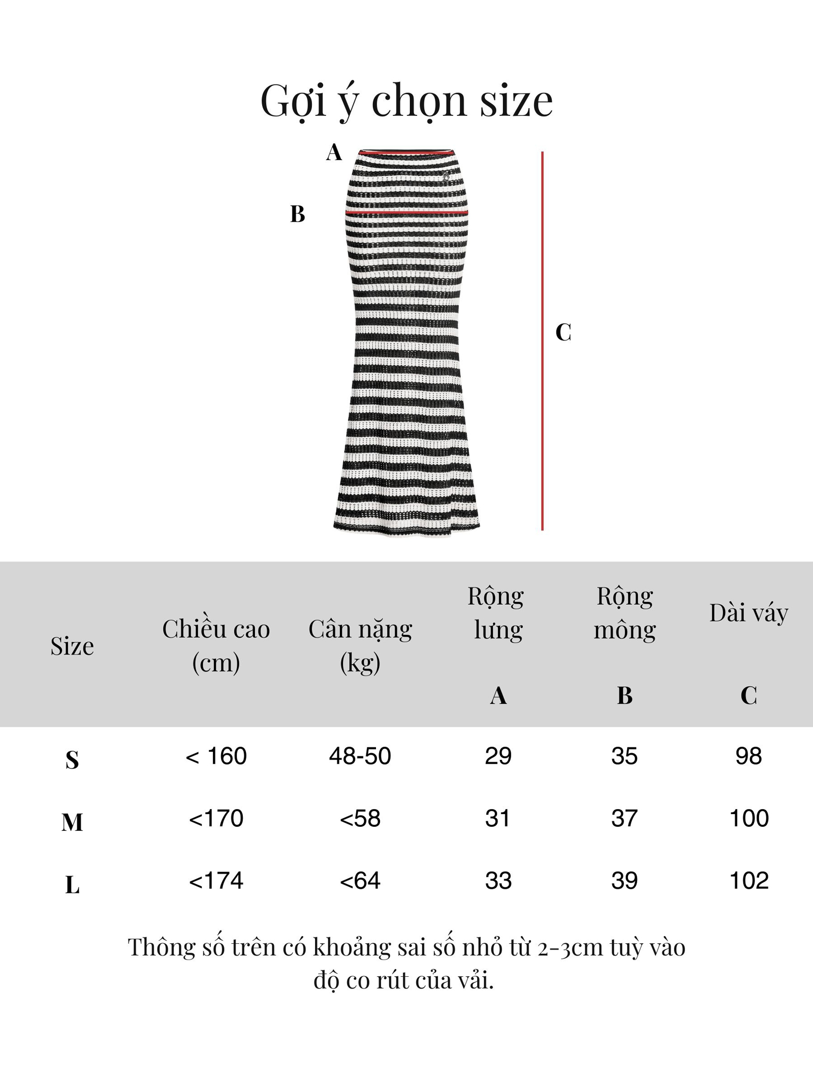 | Size | Dài váy | Rộng lưng | Rộng mông |