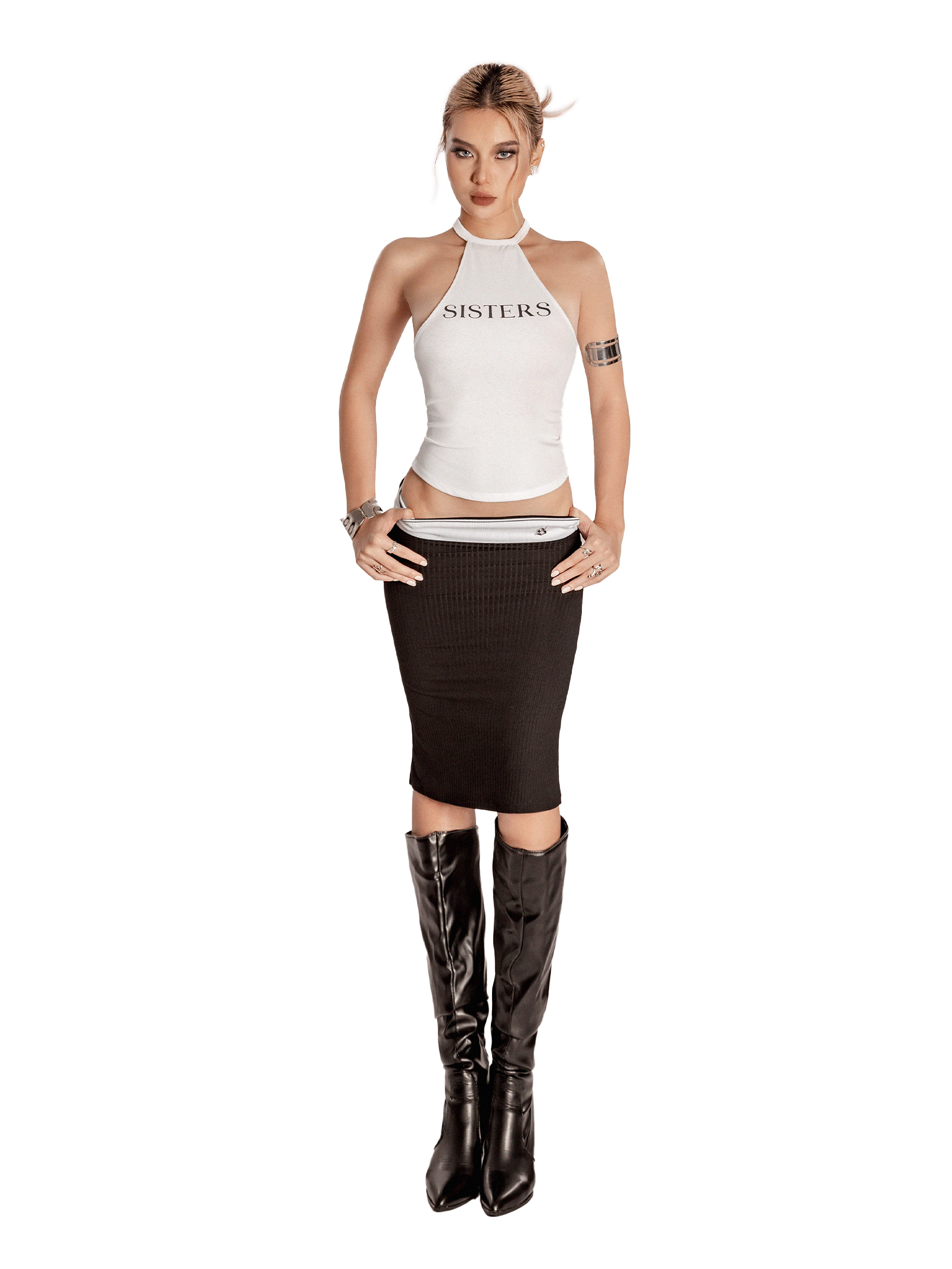 Chân váy lửng cạp thấp, form ôm body hiện đại, giúp kéo dài đôi chân và tạo điểm nhấn vòng eo ấn tượng.