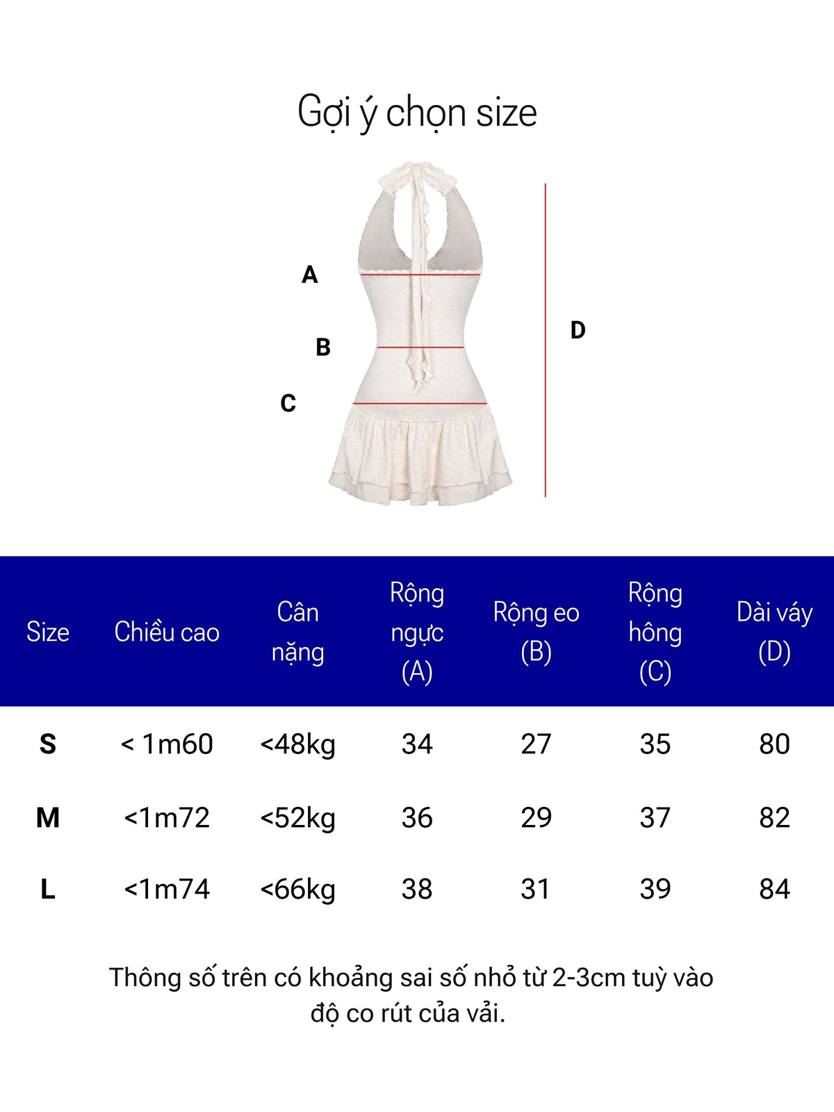 | Size | Rộng ngực | Rộng eo | Rộng hông | Dài váy |