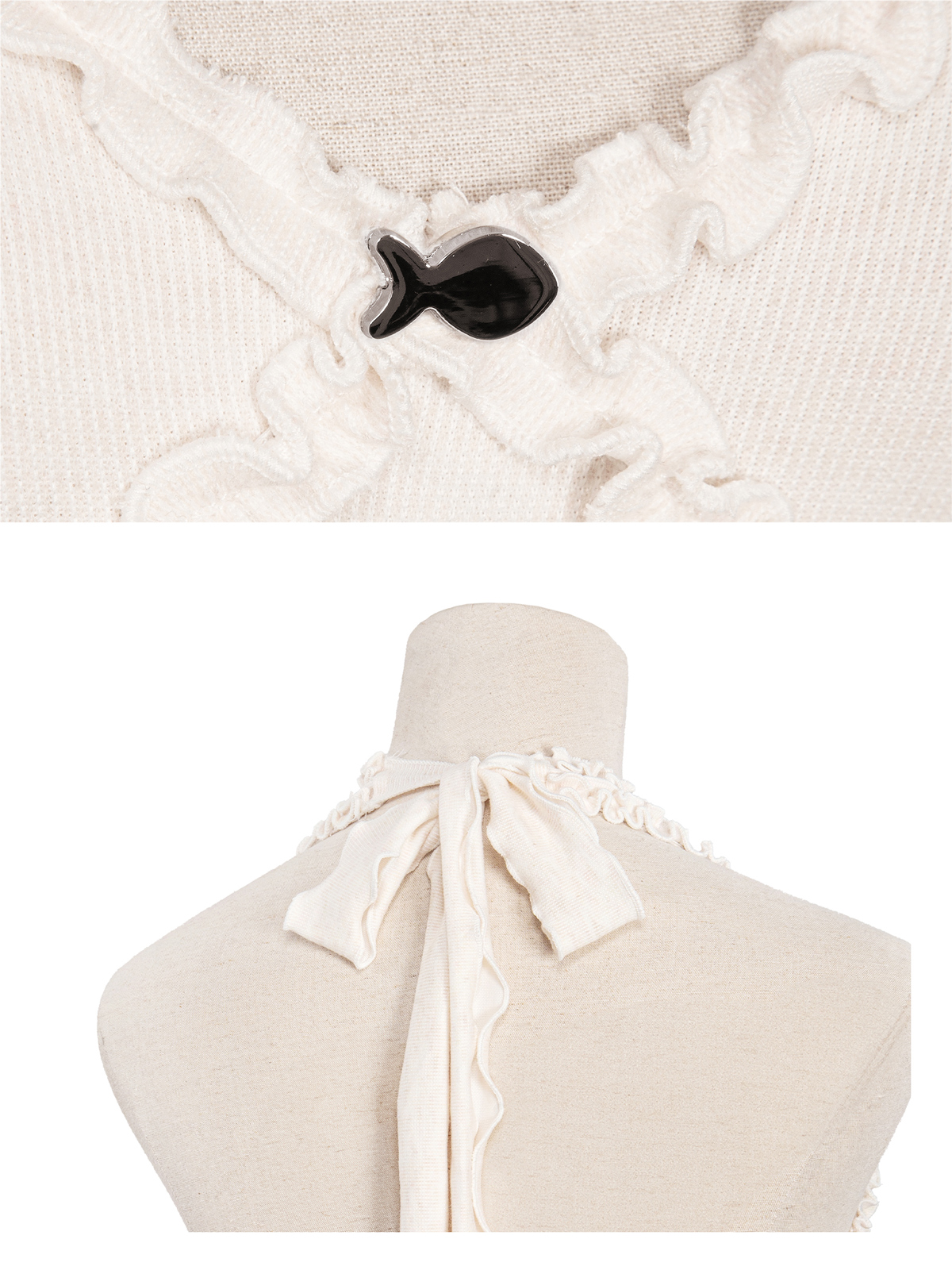 Sự điệu đà được nhấn mạnh bằng chi tiết phối viền bèo mềm mại, chạy dọc thân trên của đầm, tạo đường nét nữ tính và ngọt ngào.
