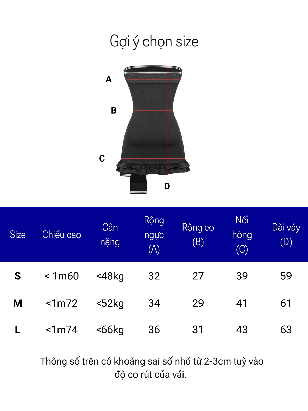 | Size | Rộng ngực | Rộng eo | Nối hông | Dài váy |