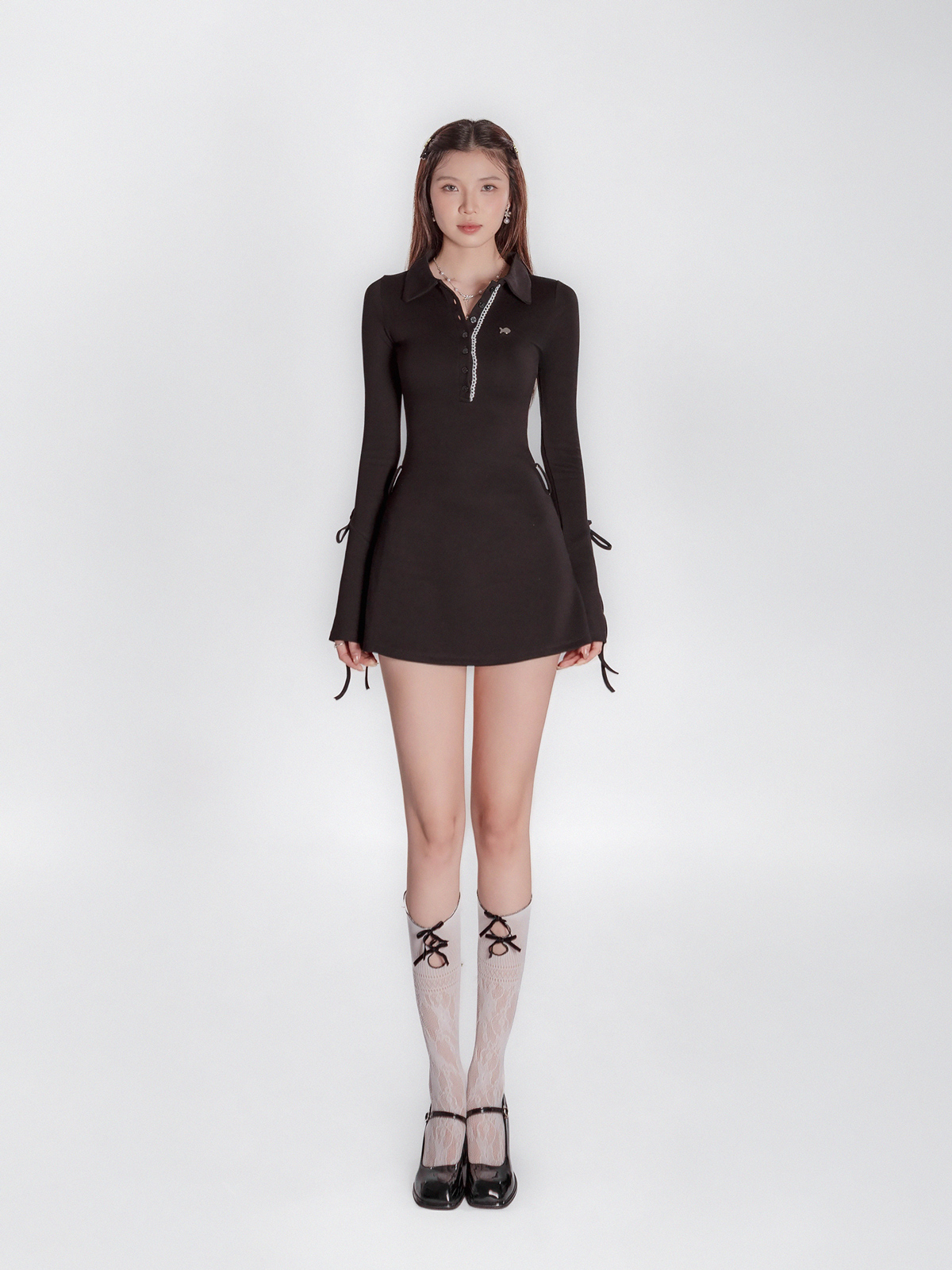 Hàng cúc phía trước được đính dây ren tinh tế, mang lại cảm giác e ấp và hoài cổ. Phần tay áo loe nhẹ nhàng, điểm xuyết thêm những chiếc nơ nhỏ xinh thắt điệu đà.