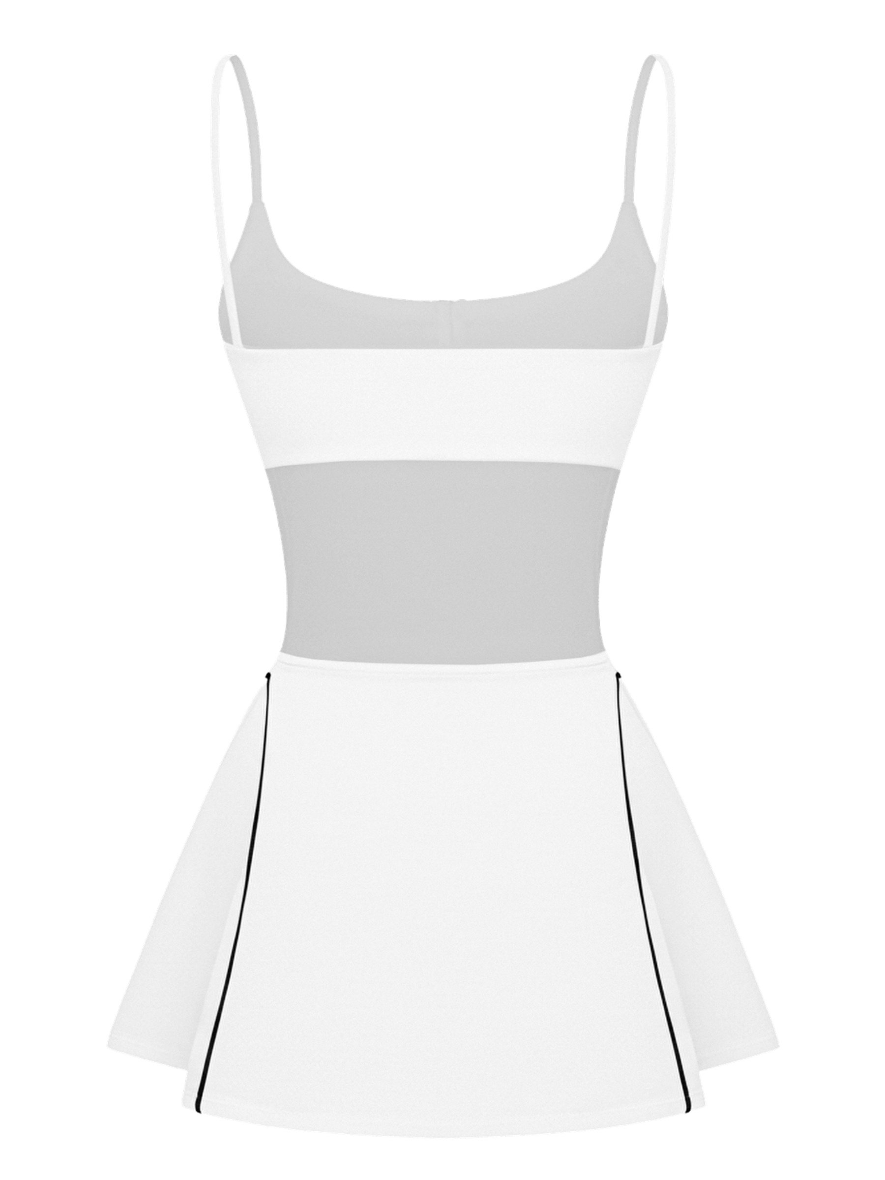 Thiết kế đầm hai dây dáng xòe trẻ trung giúp tôn vinh vóc dáng năng động nhưng không kém phần mềm mại. Sẵn mút ngực tiện lợi cho phép người mặc tự tin hoạt động.