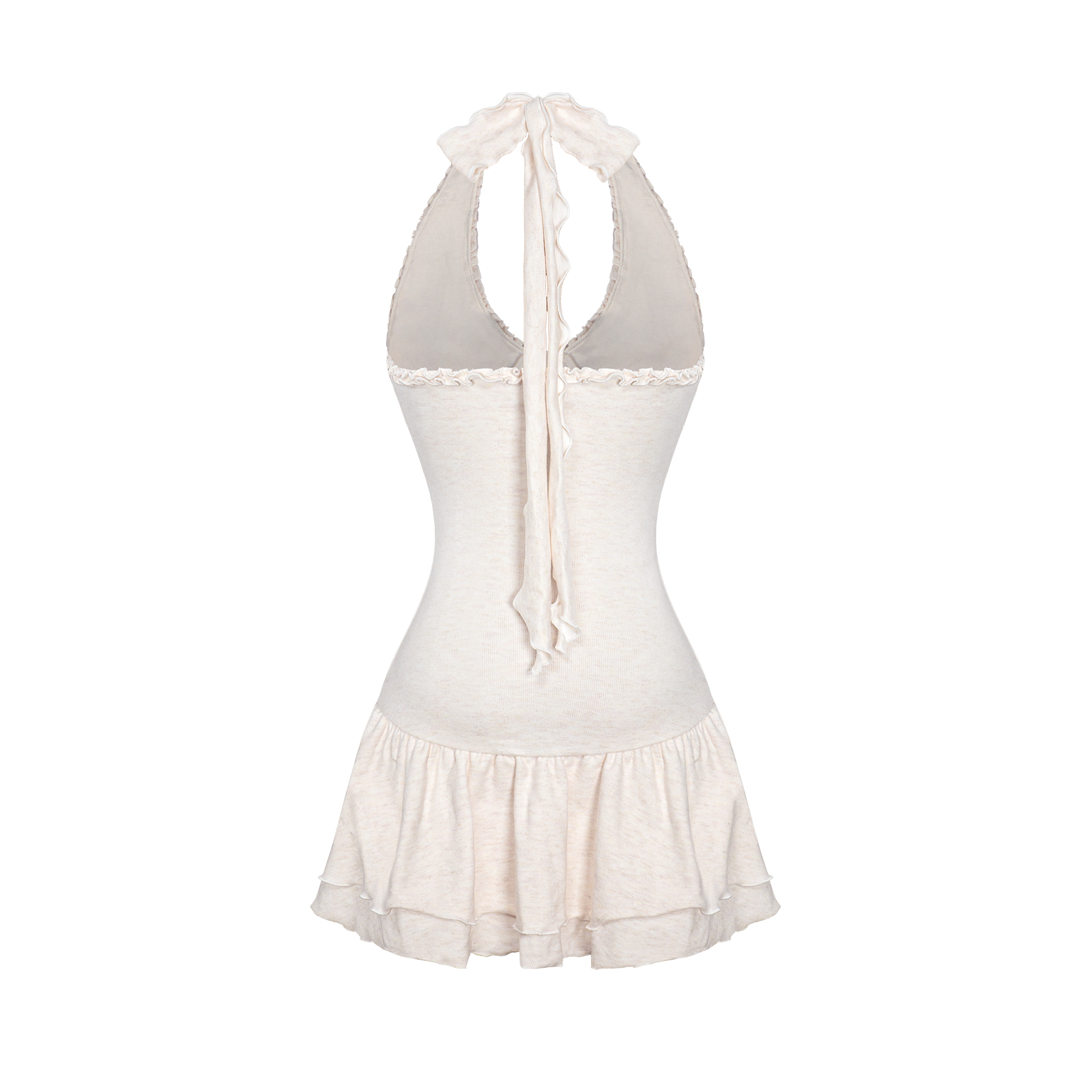Dáng đầm ôm dáng nhẹ nhàng ở thân trên, chuyển xuống form xòe ngắn xếp tầng bồng bềnh, tạo chuyển động thướt tha đầy cuốn hút. Chi tiết cột nơ xinh xắn ở cổ là điểm nhấn ngọt ngào. Cuối cùng, logo cá nhỏ nhắn được đính tinh tế, hoàn thiện dấu ấn thương hiệu.