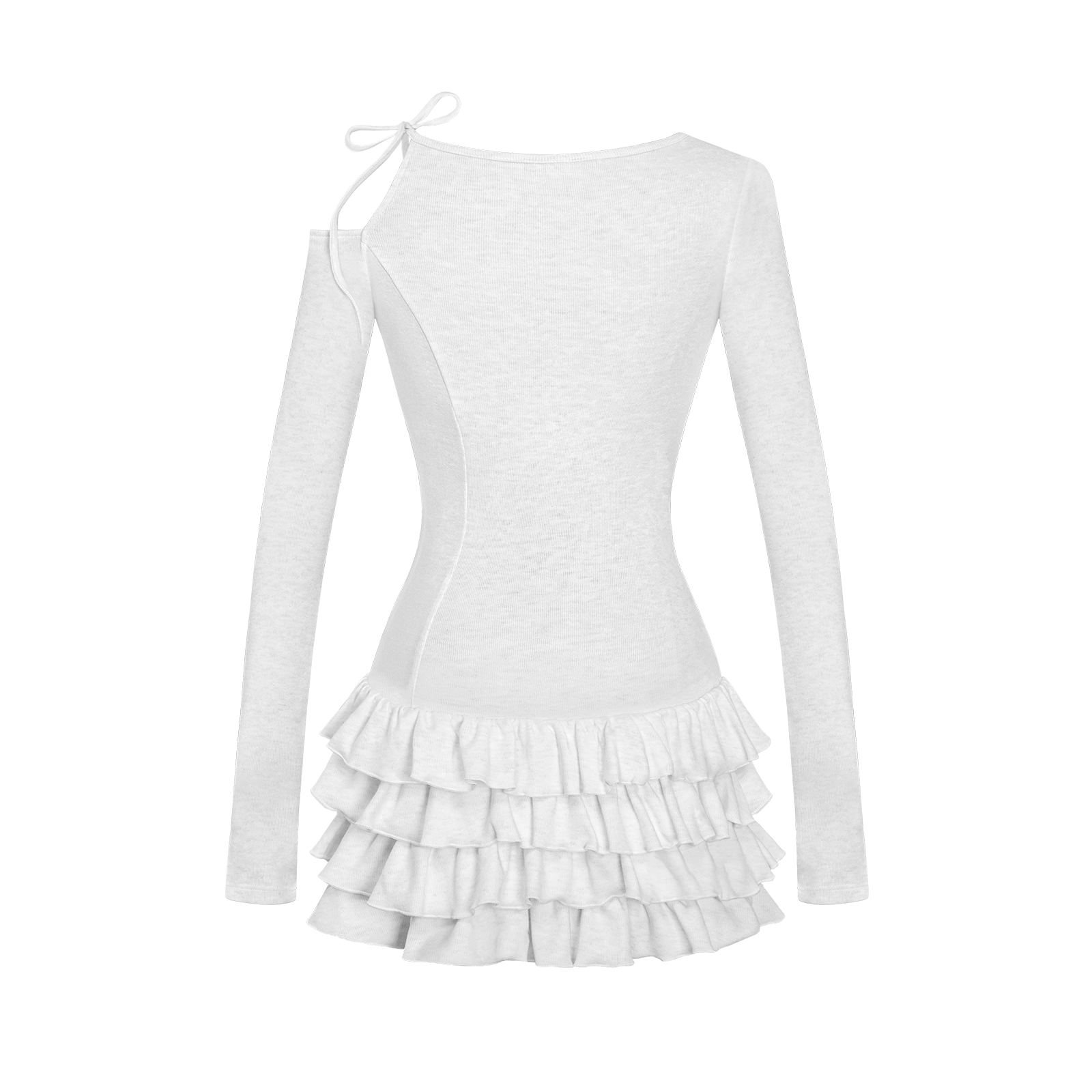 Thiết kế khoét một bên vai đầy ngẫu hứng kết hợp với chi tiết thắt dây nơ tạo nên một điểm nhấn vừa điệu đà vừa cuốn hút. Phần tay dài ôm nhẹ giúp đôi tay bé trông thật thanh thoát, trong khi dáng váy xòe xếp tầng mang lại sự bồng bềnh, đáng yêu.