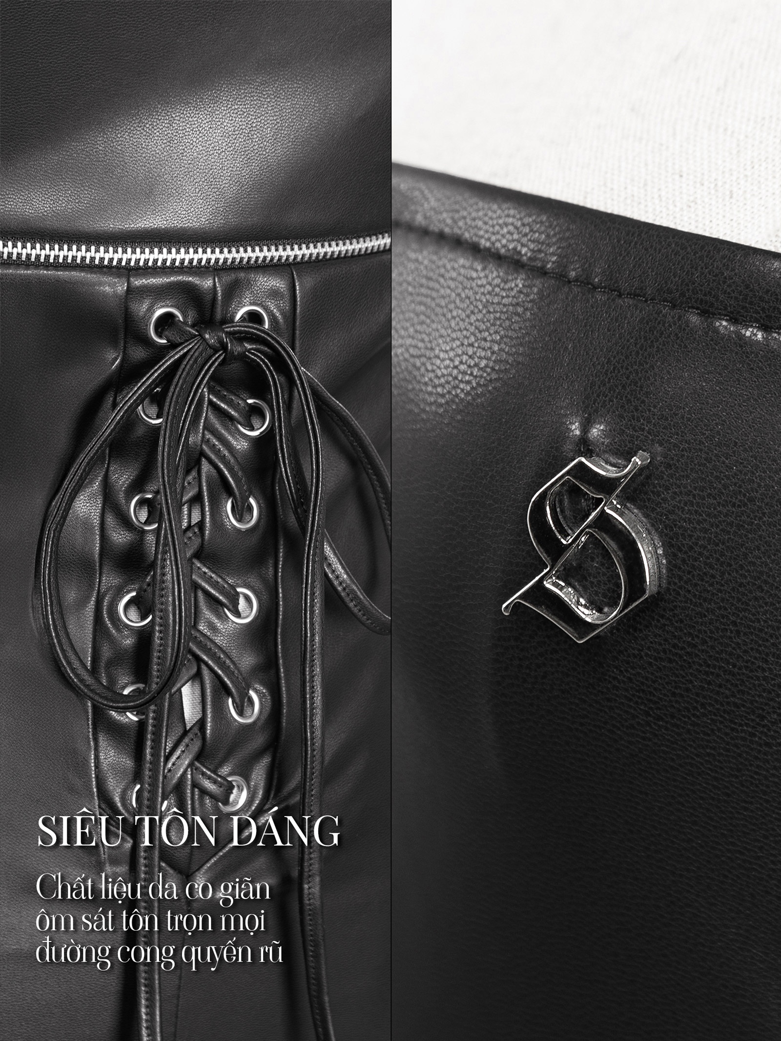 Chất liệu da co giãn, đứng form, mềm mại, gần như hòa quyện vào làn da, tạo độ ôm sát tuyệt đối và tôn lên từng đường nét quyến rũ.