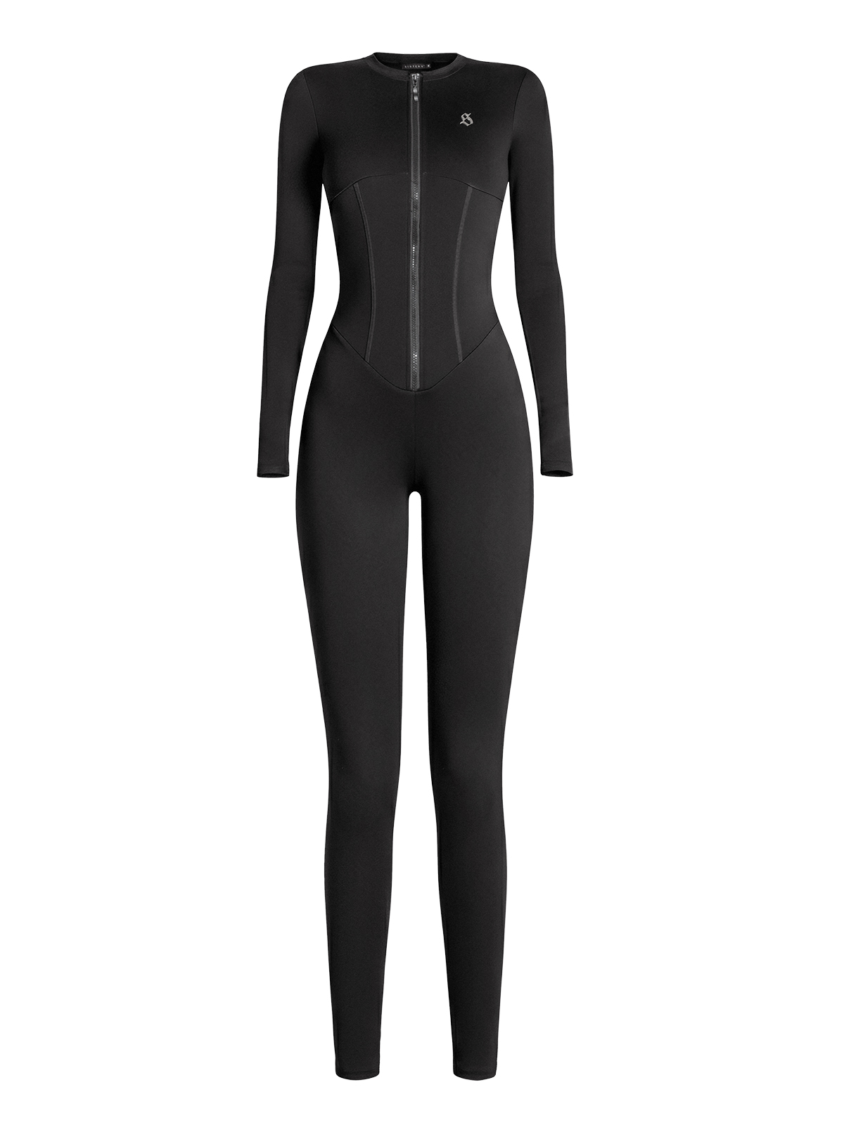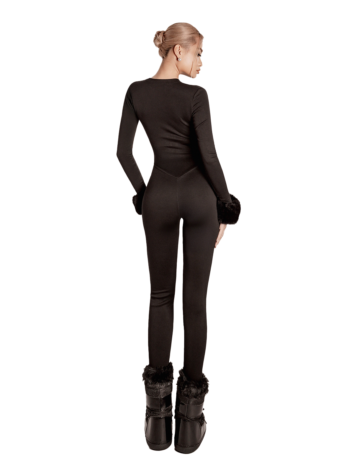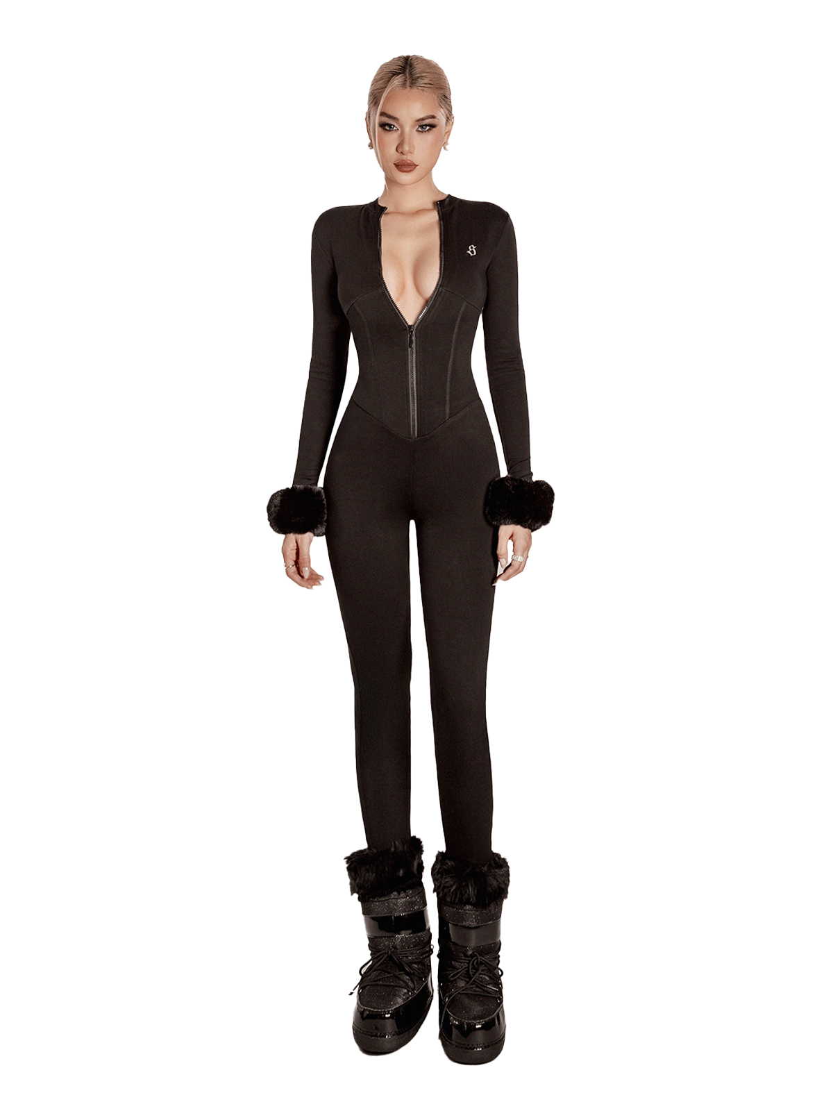 Jumpsuit có dáng dài ống bó cổ cao, tay dài cùng khóa kéo ngực có thể điều chỉnh độ gợi cảm, kết hợp đường viền eo giúp tôn dáng thon gọn rõ nét.