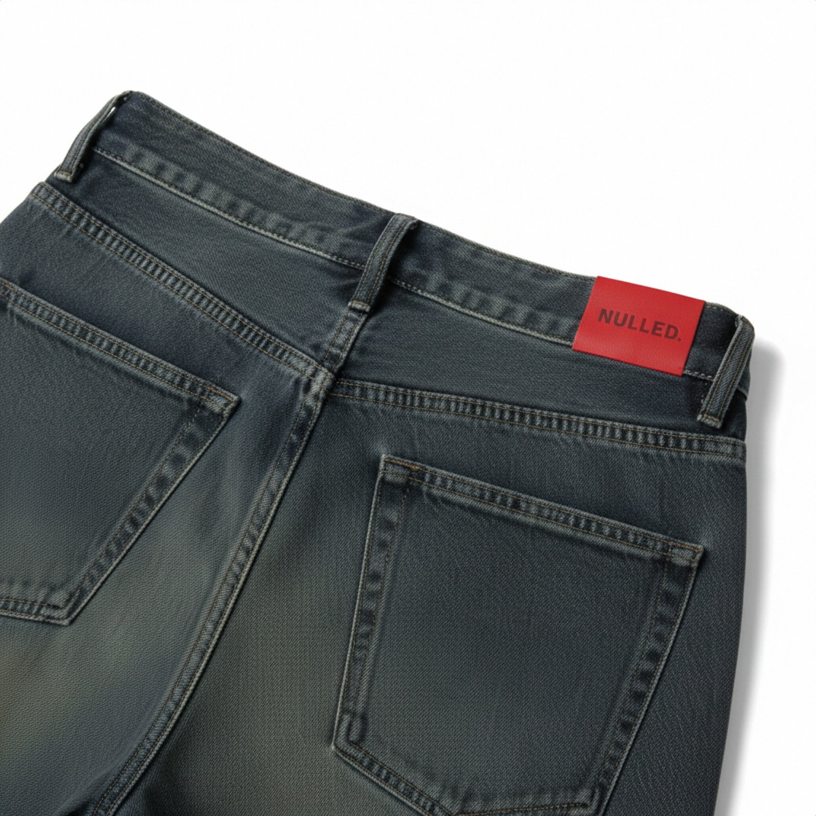 Một trong những chi tiết đặc trưng của chiếc quần jean lửng nam này là tag da màu đỏ in logo NULLED. được đặt ở phía sau cạp quần. Sự tương phản giữa màu đỏ rực và nền denim trầm tạo nên điểm nhấn thị giác cực mạnh.