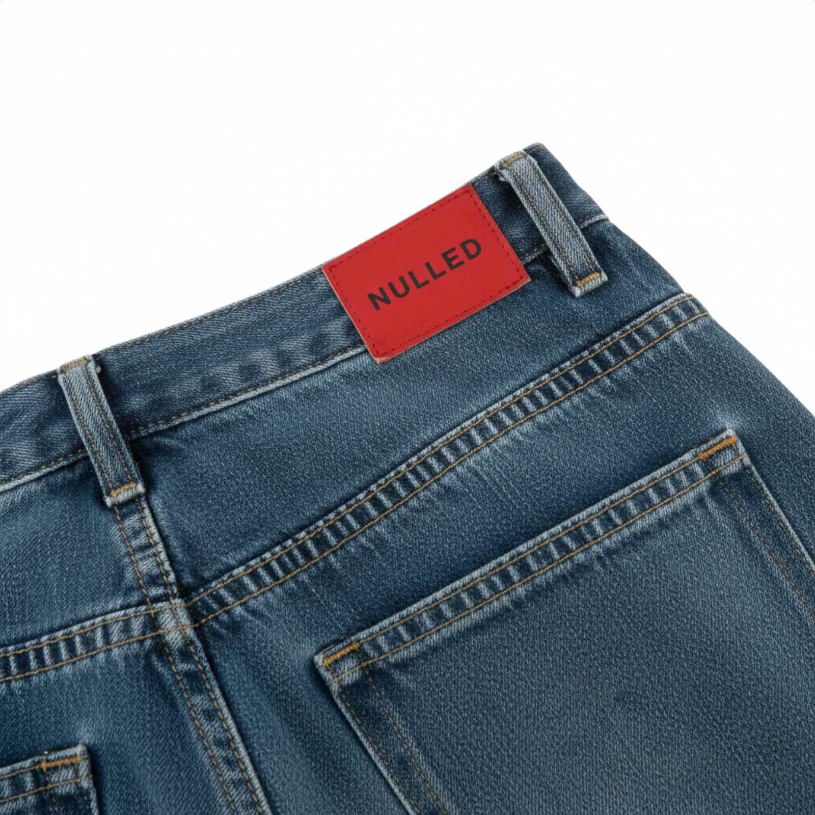 Trên nền denim xanh đậm, tag da đỏ với logo NULLED tạo nên sự tương phản mạnh mẽ, thu hút ánh nhìn và thể hiện rõ nét cá tính của thương hiệu.