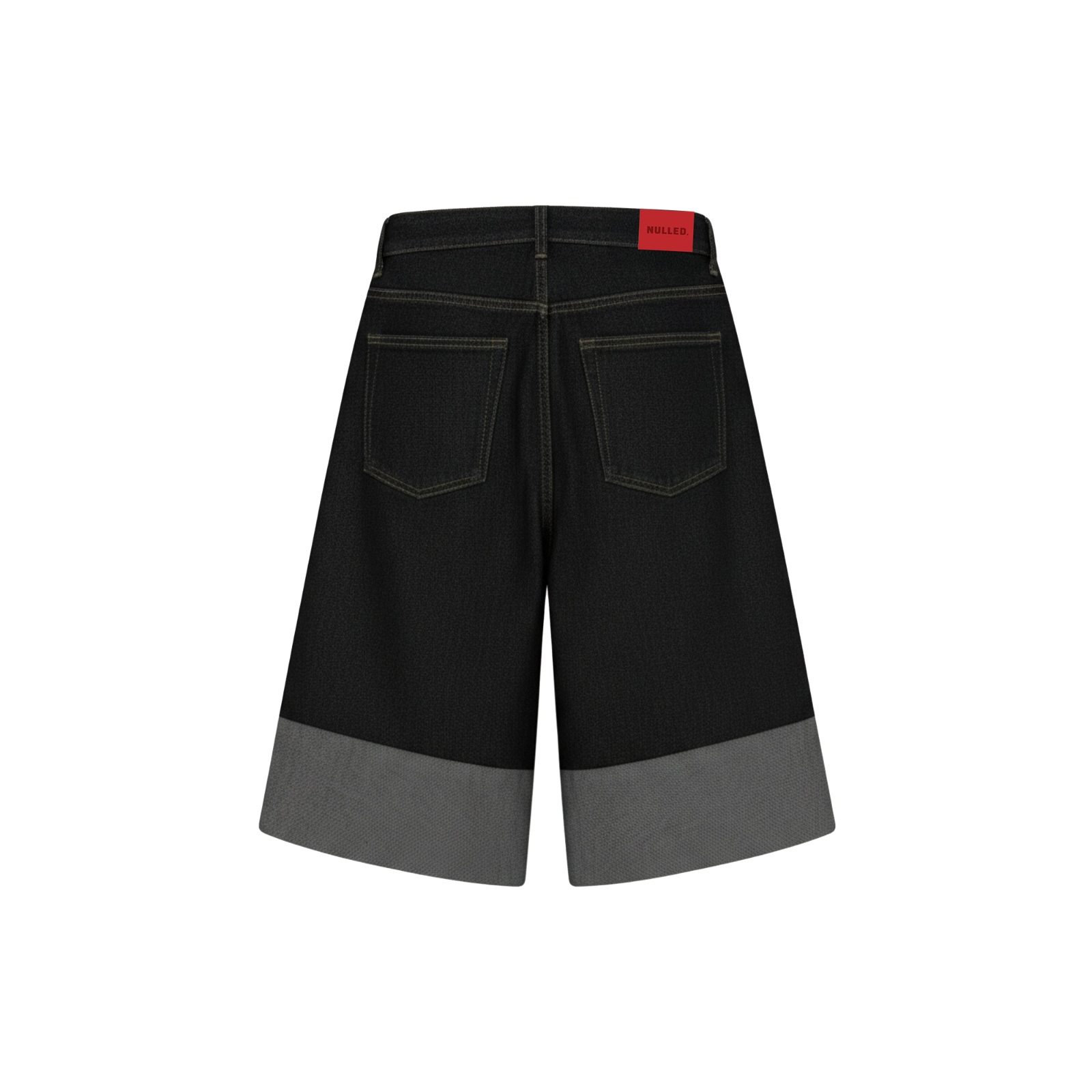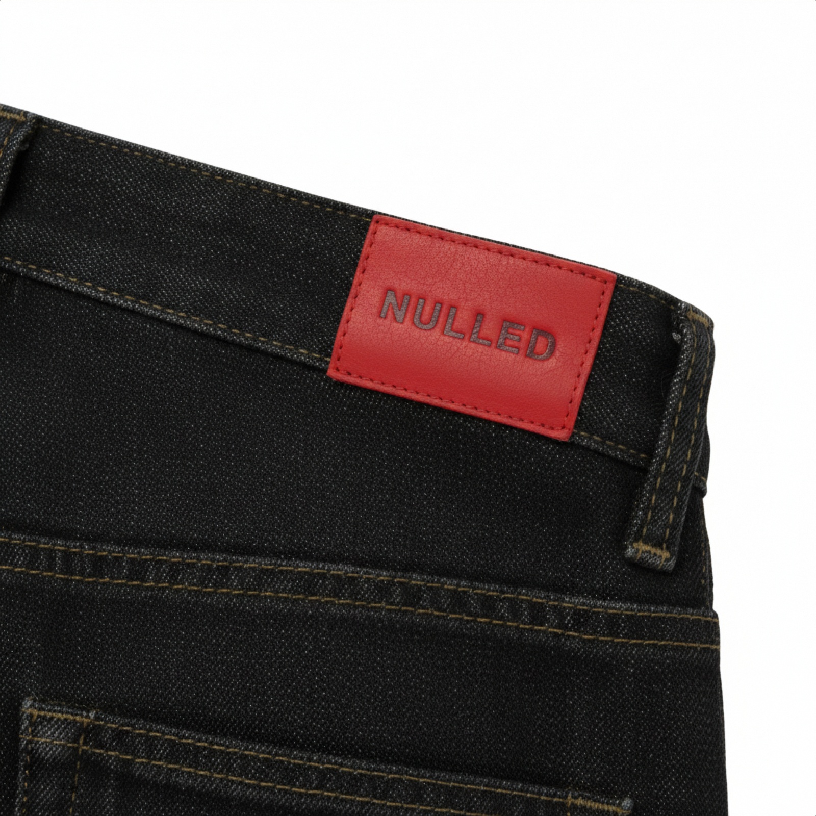 Ở phía sau, tag da màu đỏ nổi bật với logo “NULLED.” được gắn trên nền denim đen, tạo nên điểm nhấn thị giác cực mạnh – một chi tiết đặc trưng thể hiện cá tính thương hiệu.