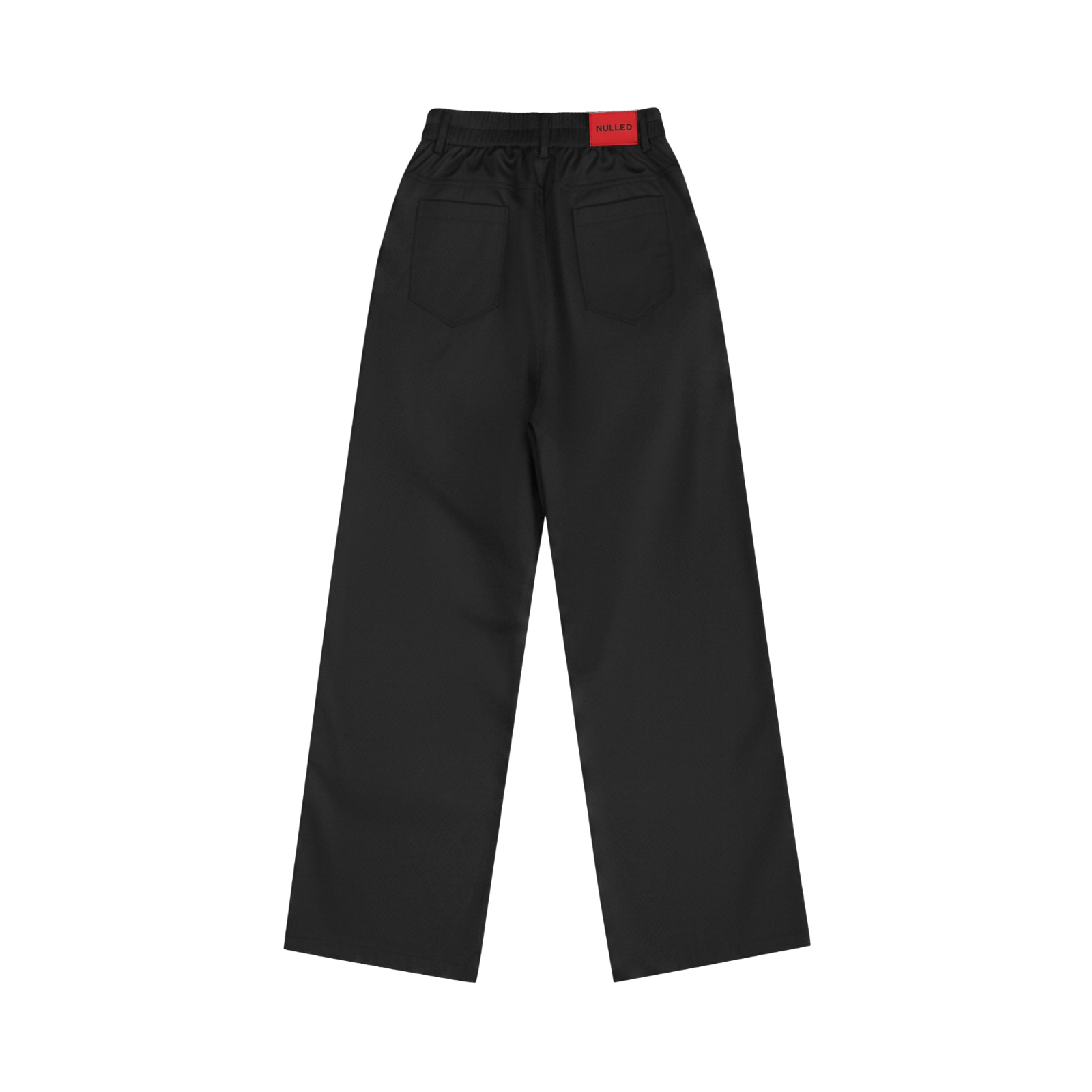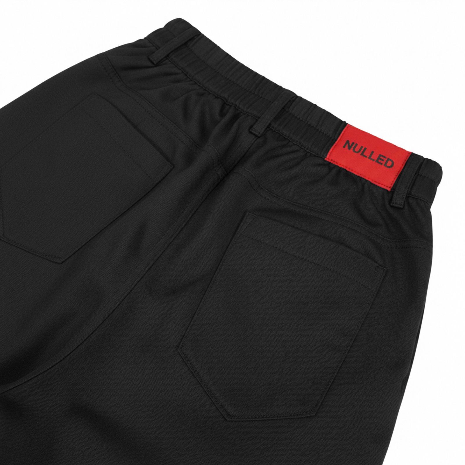 Sản phẩm được nhấn nhá bằng Tag logo NULLED đỏ nổi bật, tạo điểm nhấn thị giác mạnh mẽ trên nền vải đen. Chi tiết xếp ly trước được xử lý tỉ mỉ, giúp quần có độ rũ tự nhiên và tăng thêm phần cá tính cho tổng thể bộ đồ.
