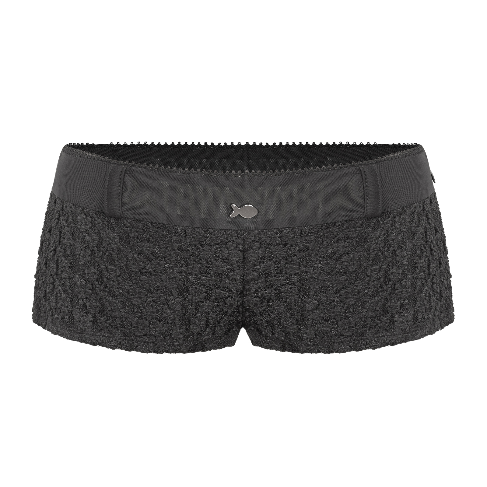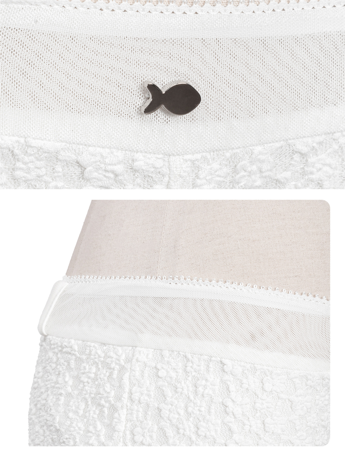 Thiết kế lưng quần xuyên thấu tinh tế, kết hợp chi tiết đính logo cá nhỏ nhắn, mang lại sự duyên dáng và khác biệt cho món đồ tưởng chừng như chỉ có chức năng bảo hộ.
