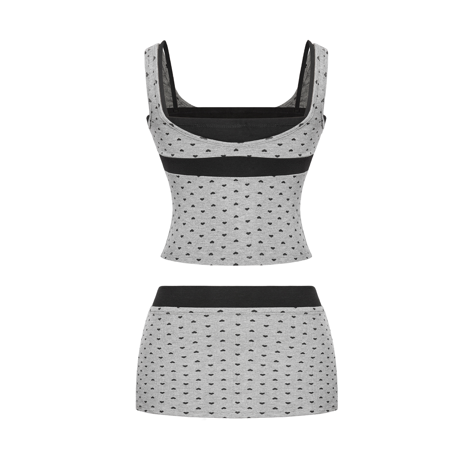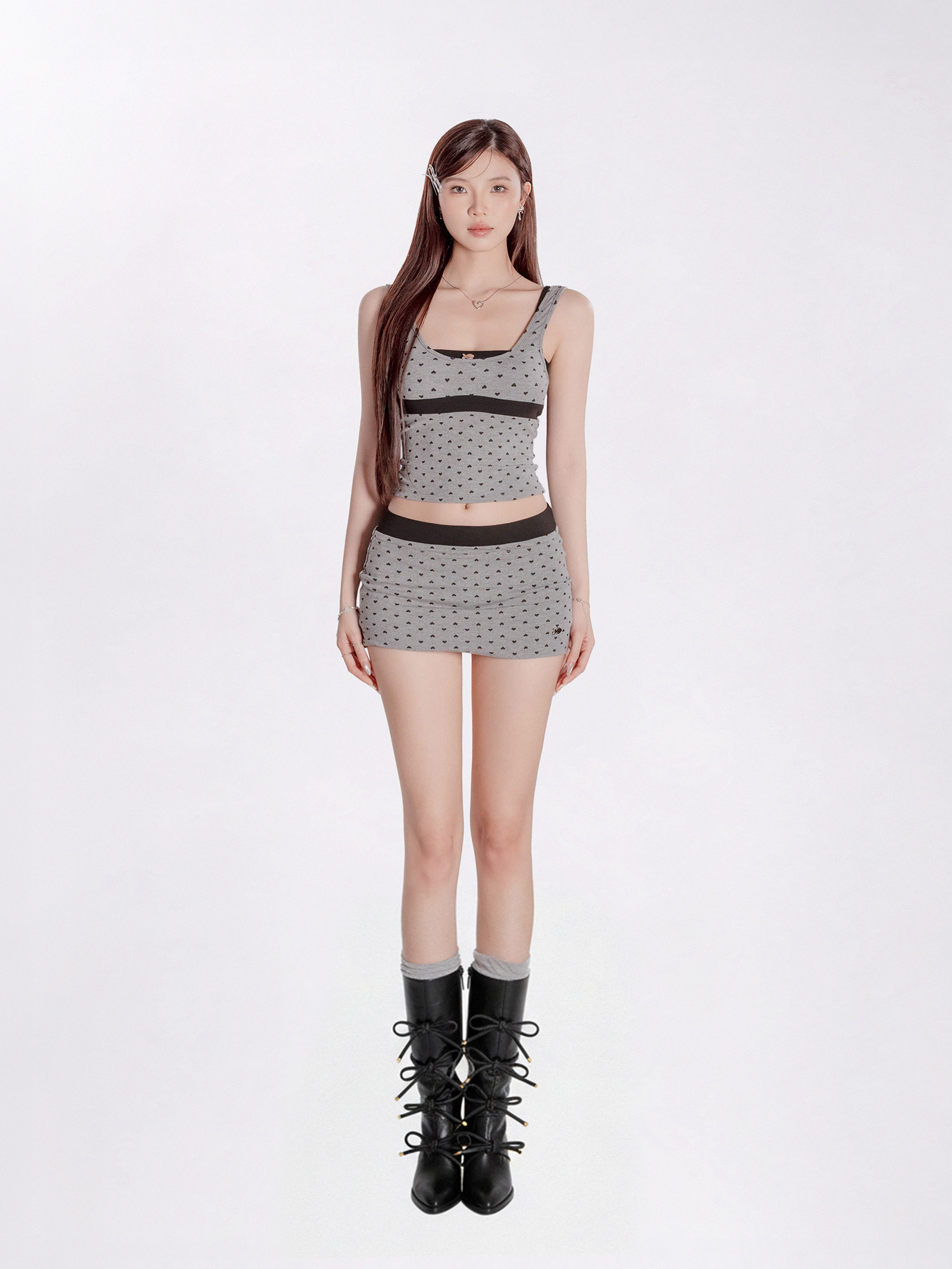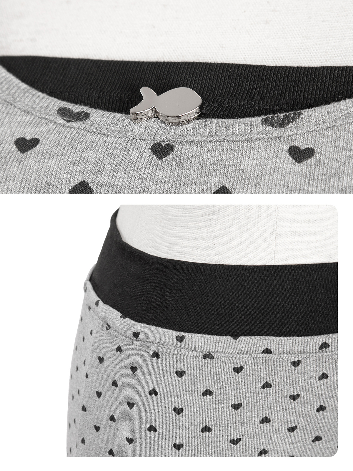 Họa tiết chính của set đồ là những chấm bi hình trái tim nhỏ nhắn, ngọt ngào, được in nổi bật trên nền vải xám trang nhã. Chất liệu chính là thun rib lụa mềm mại, có độ co giãn nhẹ, mang lại cảm giác thoải mái và êm ái cho bé khi diện cả ngày dài.