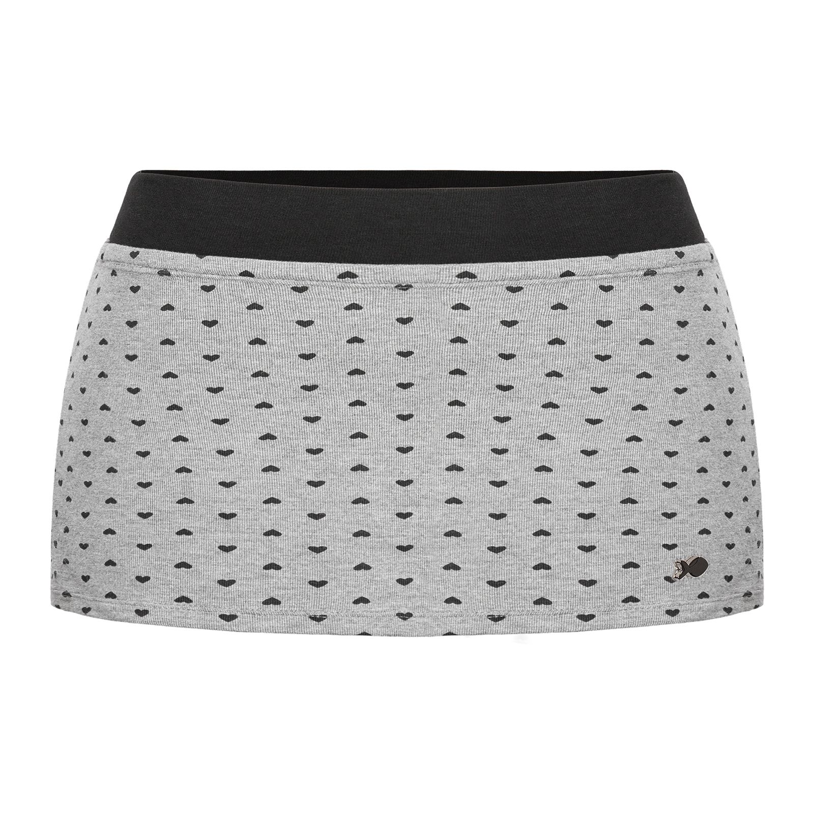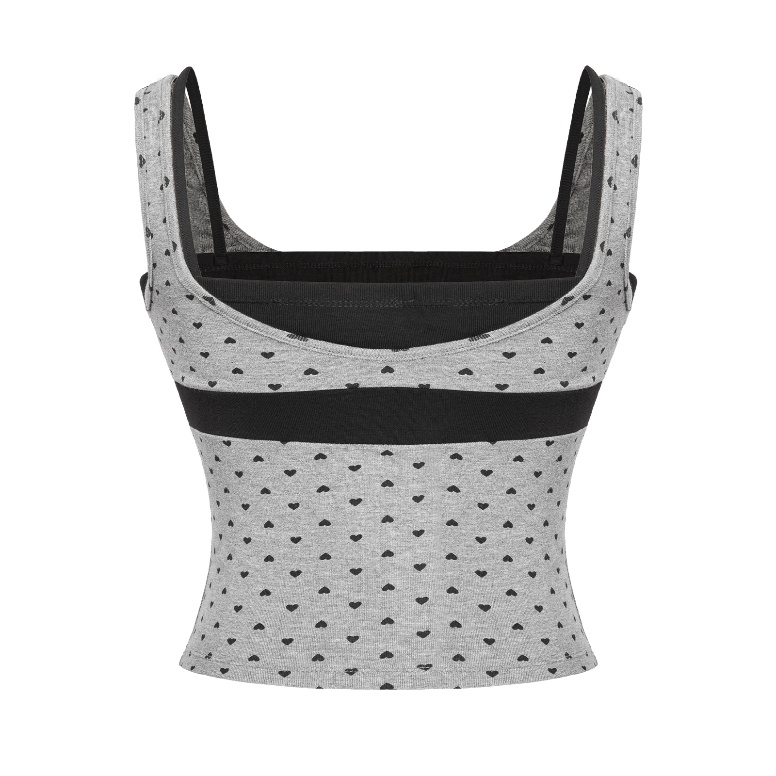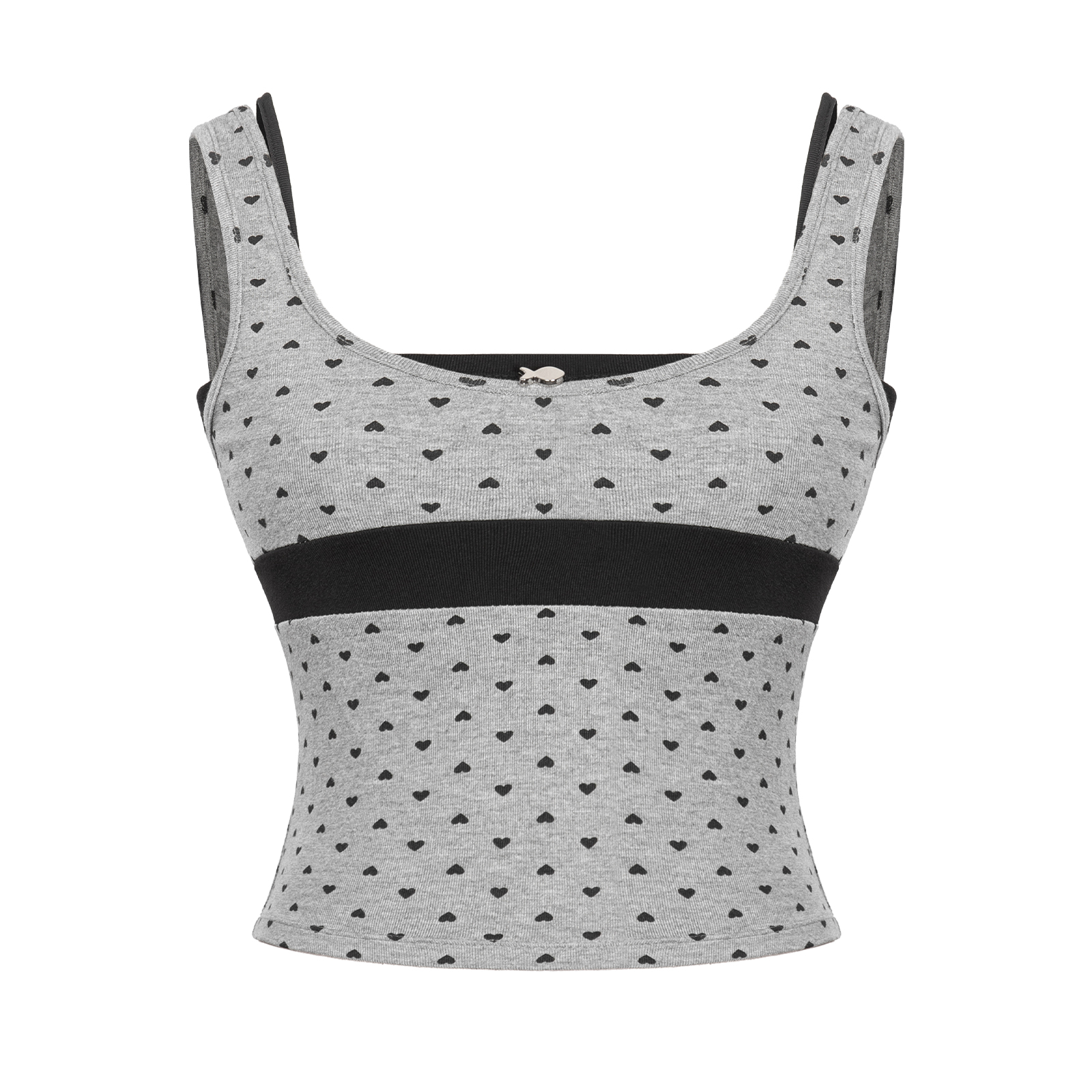 Họa tiết chính của set đồ là những chấm bi hình trái tim nhỏ nhắn, ngọt ngào, được in nổi bật trên nền vải xám trang nhã. Chất liệu chính là thun rib lụa mềm mại, có độ co giãn nhẹ, mang lại cảm giác thoải mái và êm ái cho bé khi diện cả ngày dài.