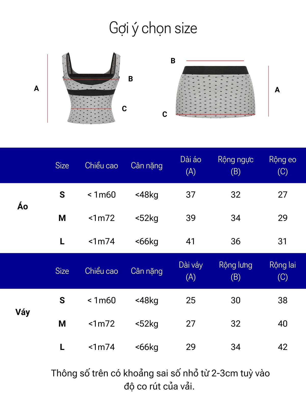 | Chân váy | Size | Dài váy | Rộng lưng | Rộng lai |