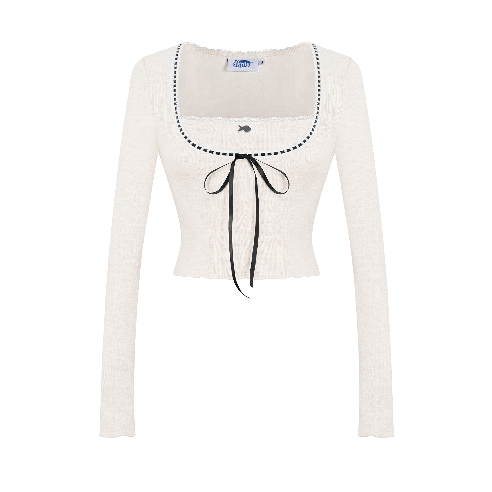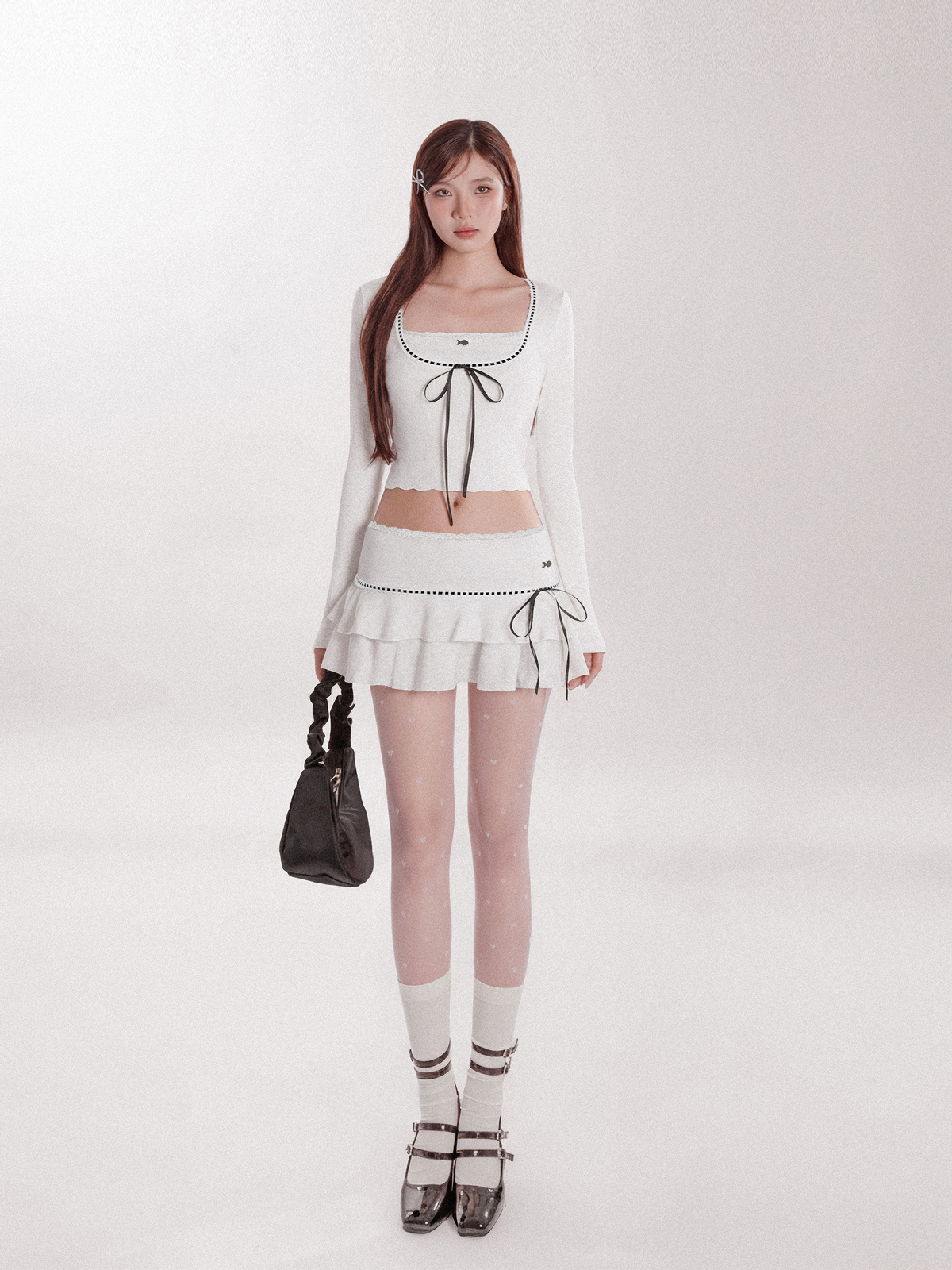 Chiếc áo croptop cổ vuông giúp bé khoe khéo nét duyên dáng của xương quai xanh. Những chi tiết phối ren và ruy băng thắt nơ được đính kết điệu đà, tạo nên vẻ ngoài xinh yêu vô cùng. Tay áo dài ôm nhẹ vào cơ thể, mang lại sự thoải mái nhưng vẫn giữ được nét nữ tính cho bé.