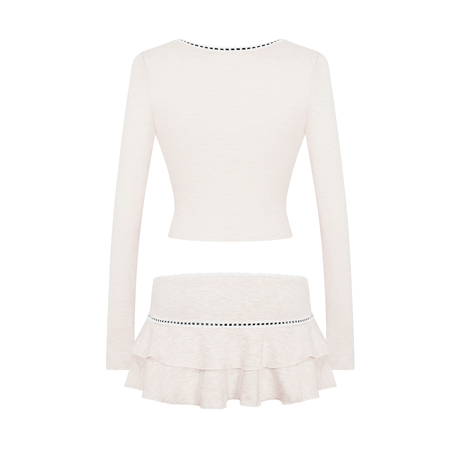 Sắc kem của Ribbon Set mang đến cảm giác dịu ngọt và tinh khôi. Trên nền vải thun rib muối tiêu độc đáo, bộ trang phục hiện lên thật xinh xắn và kiêu kỳ.