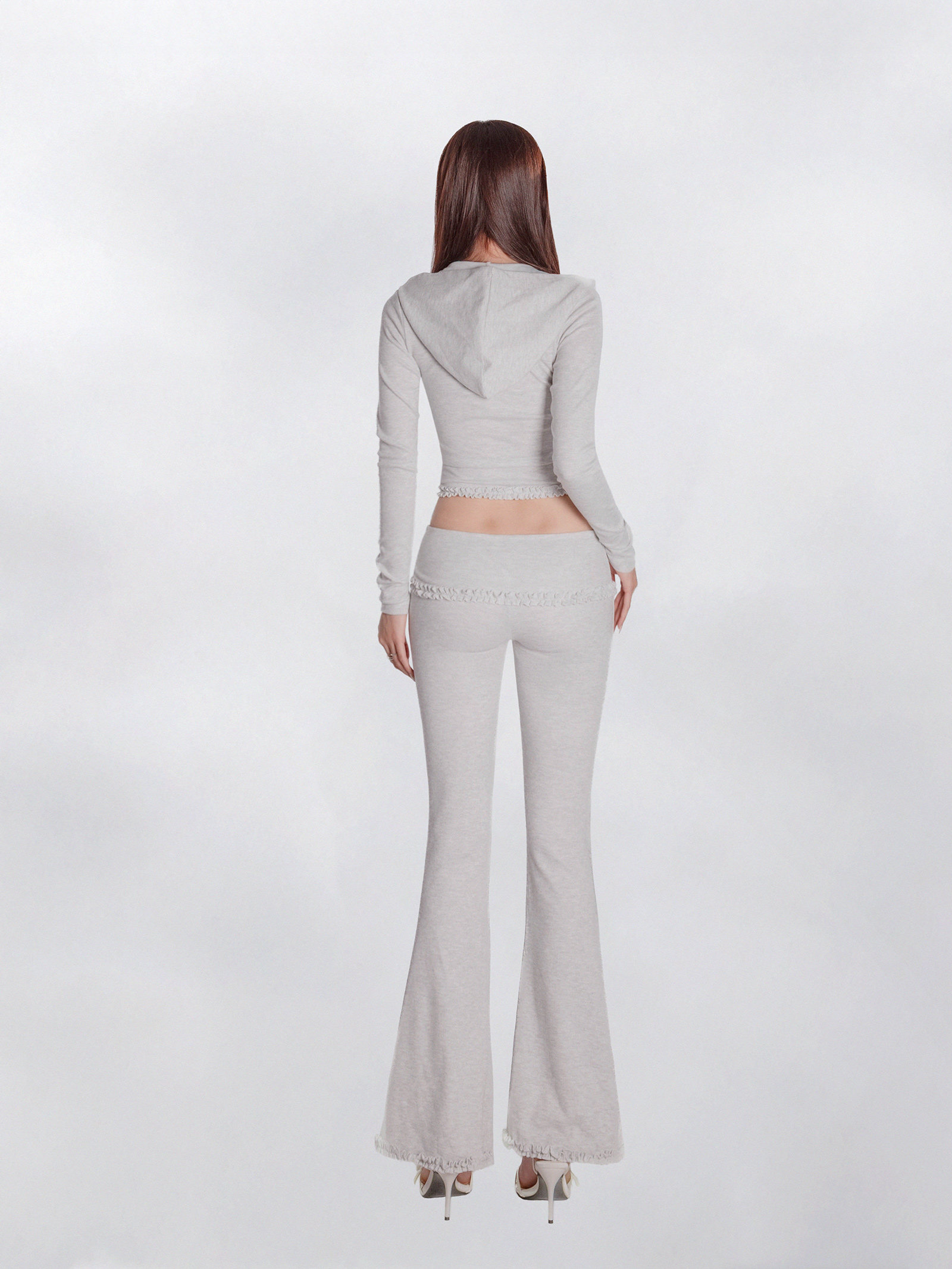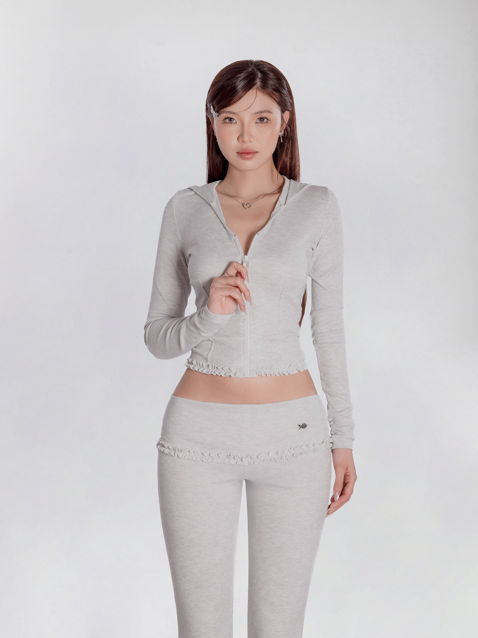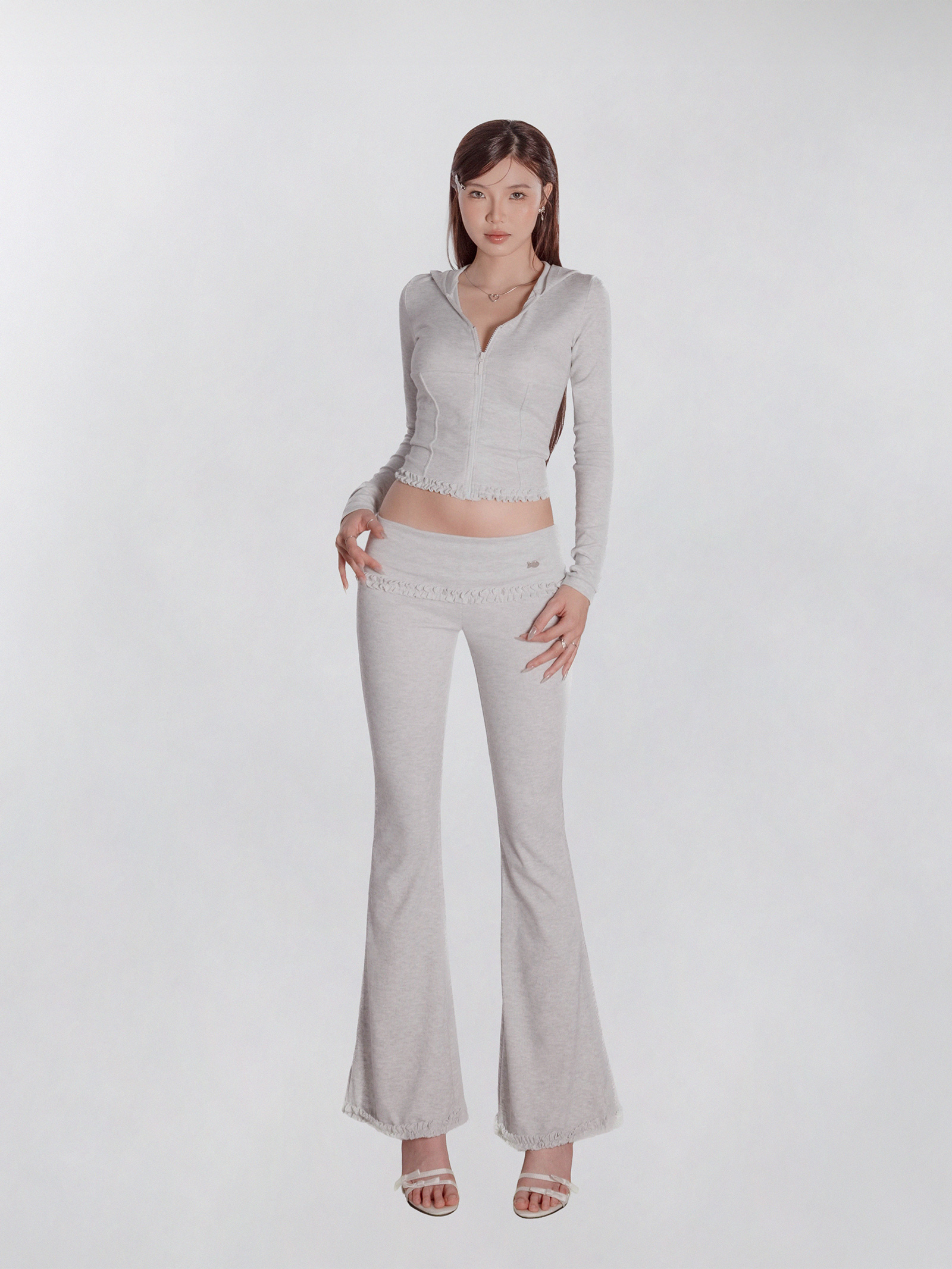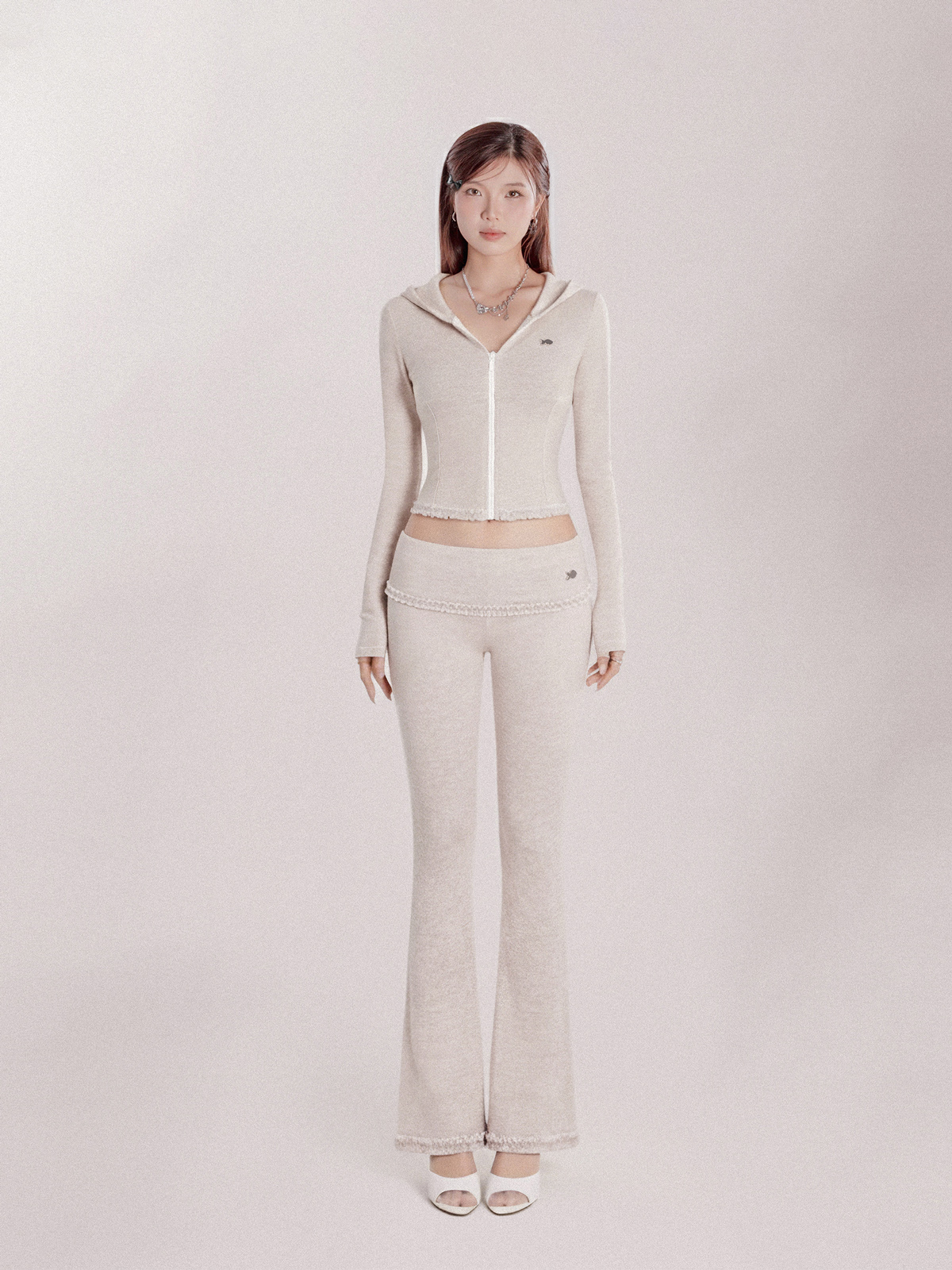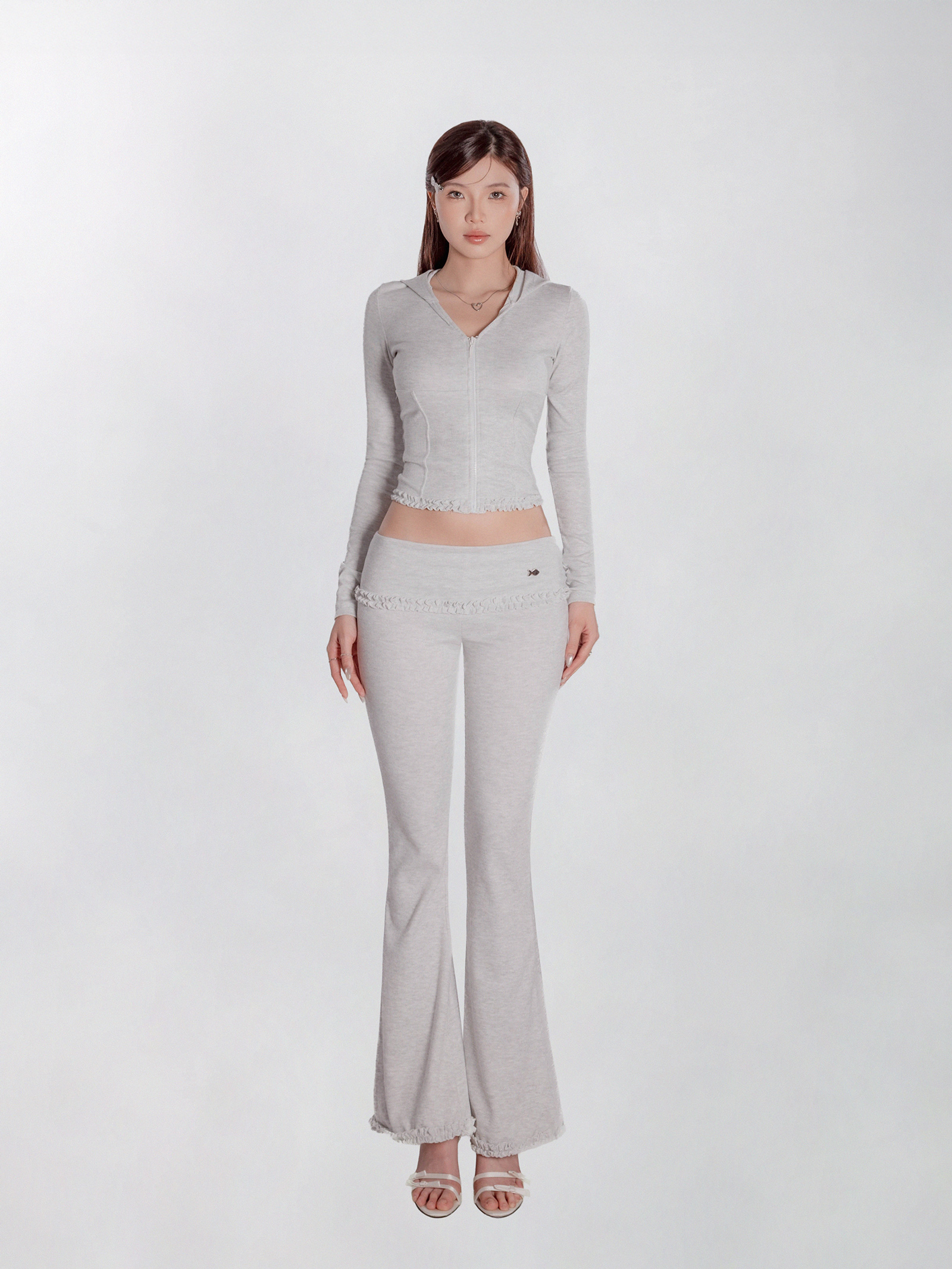 Nét điệu đà nhất của set đồ được tôn lên nhờ chiếc quần ống loe cạp thấp hiện đại, khéo léo làm nổi bật vóc dáng duyên dáng của bé. Điểm nhấn lãng mạn tuyệt đối là hoạ tiết phối bèo lưng lật mềm mại, tạo nên một đường nét nữ tính và đáng yêu độc đáo ở phía sau.