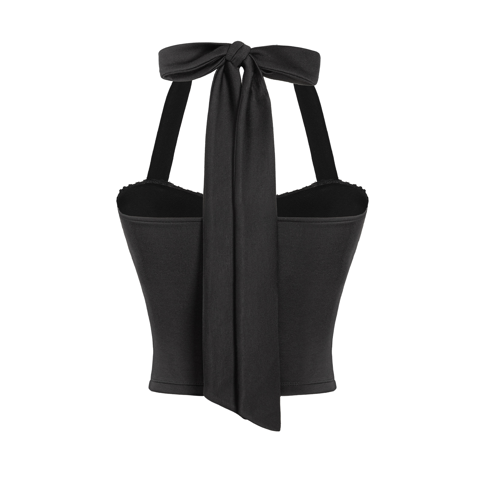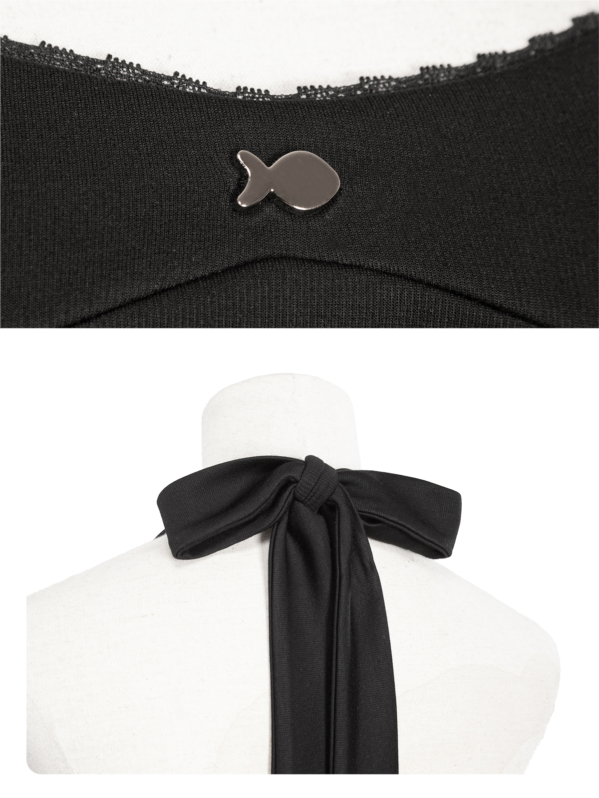 Đây là một thiết kế croptop với kiểu dáng cổ yếm thanh thoát kết hợp cúp ngực duyên dáng, giúp tôn lên bờ vai mềm mại và xương quai xanh e ấp của bé. Điểm nhấn nữ tính tuyệt vời là hoạ tiết phối viền ren tinh tế, tạo nên đường nét mềm mại và điệu đà trên nền đen.