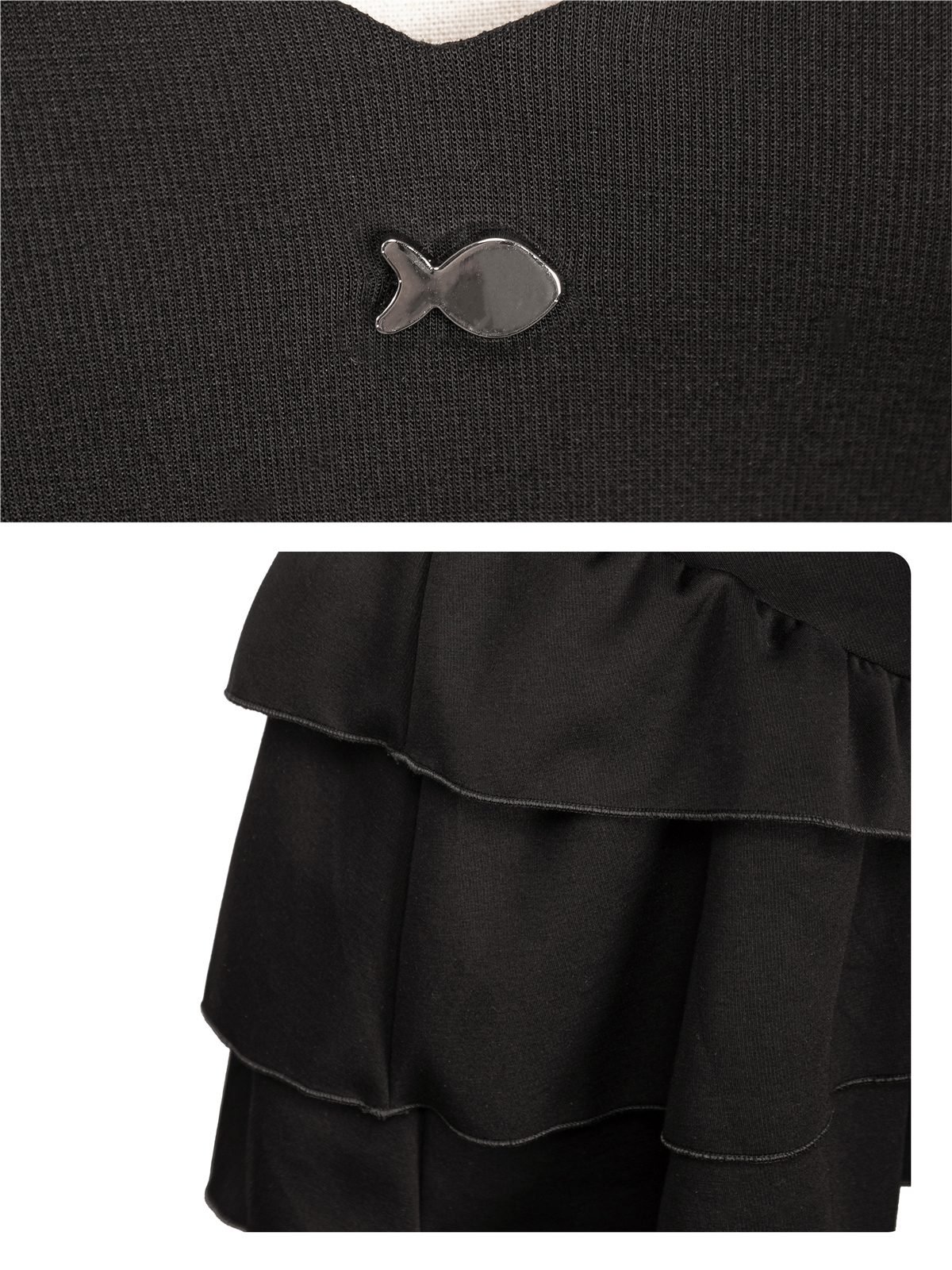 Đầm được may từ chất liệu thun 2 da có độ co giãn tốt, giữ form dáng đẹp. Cuối cùng, logo cá nhỏ nhắn được đính kiêu kỳ, hoàn thiện dấu ấn DKMV.