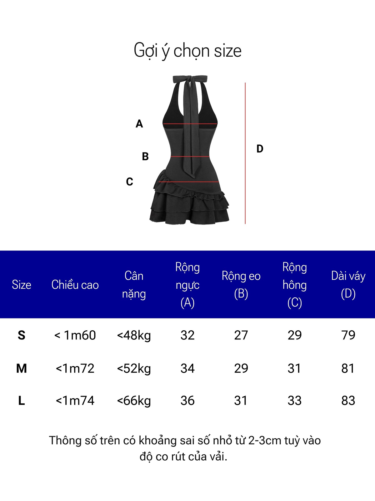 | Size | Rộng ngực | Rộng eo | Rộng hông | Dài váy |