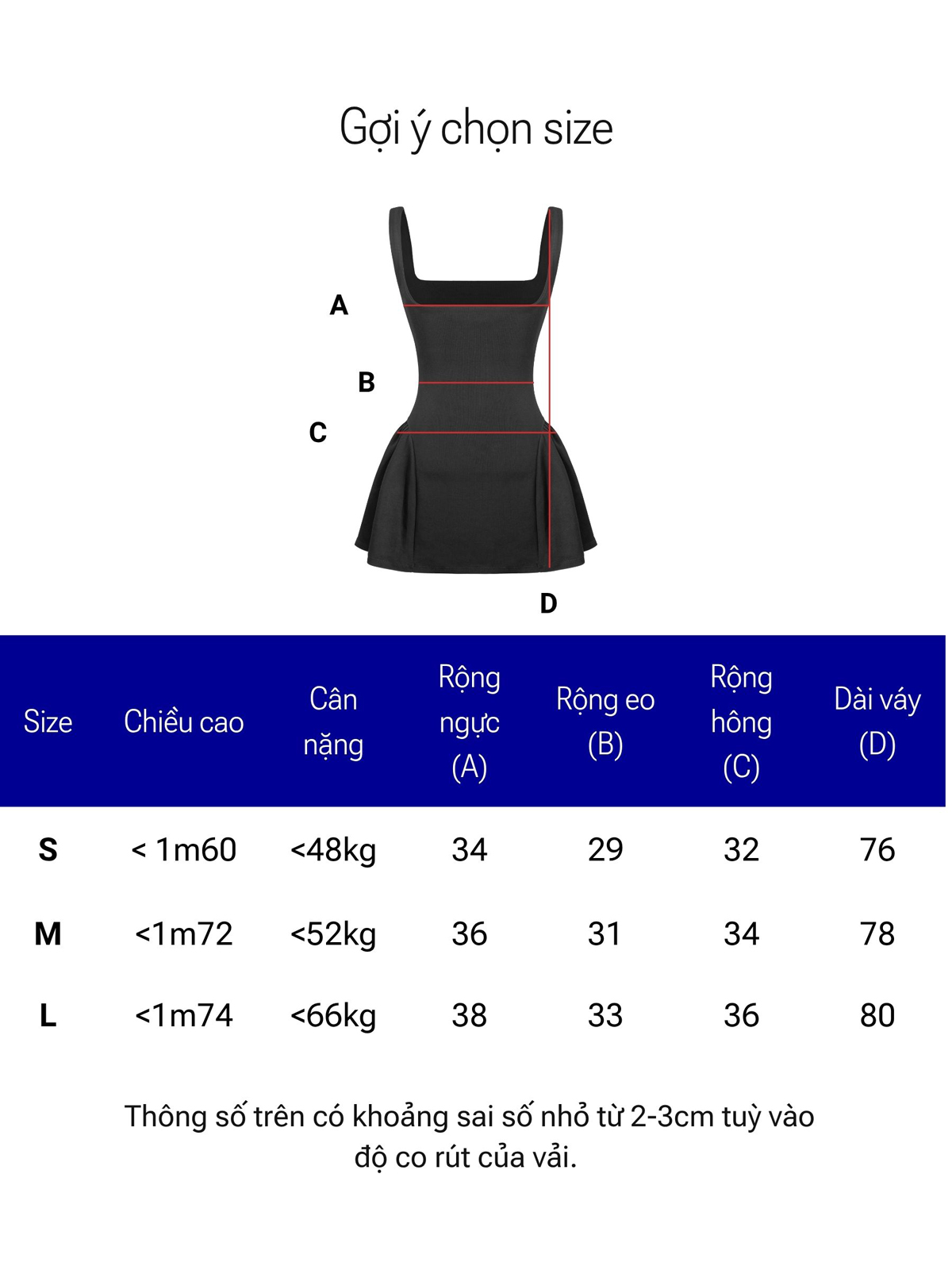 | Size | Rộng ngực | Rộng eo | Rộng hông | Dài váy |