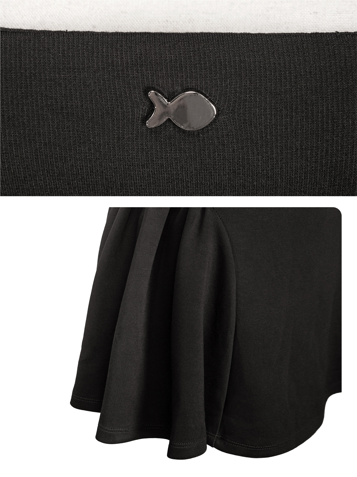 Đầm được chế tác từ chất liệu thun 2 da co giãn êm ái, mang lại cảm giác mềm mại và sự thoải mái tối đa. Sự đáng yêu được hoàn thiện bằng chi tiết đính logo cá inox nhỏ nhắn, lấp lánh tinh nghịch, tạo điểm nhấn nữ tính trên nền vải đen.