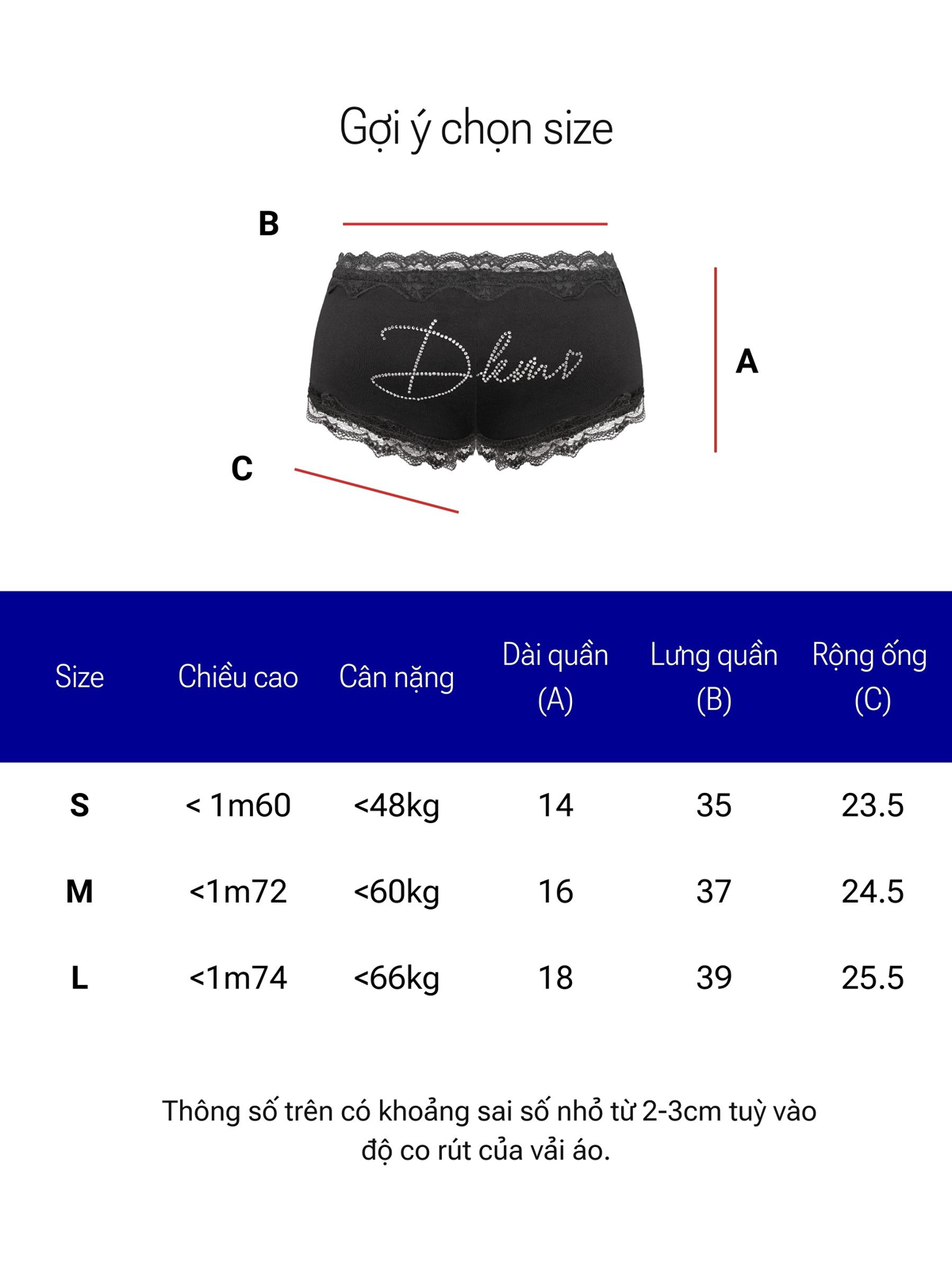 | Size | Dài quần | Rộng lưng | Rộng ống |