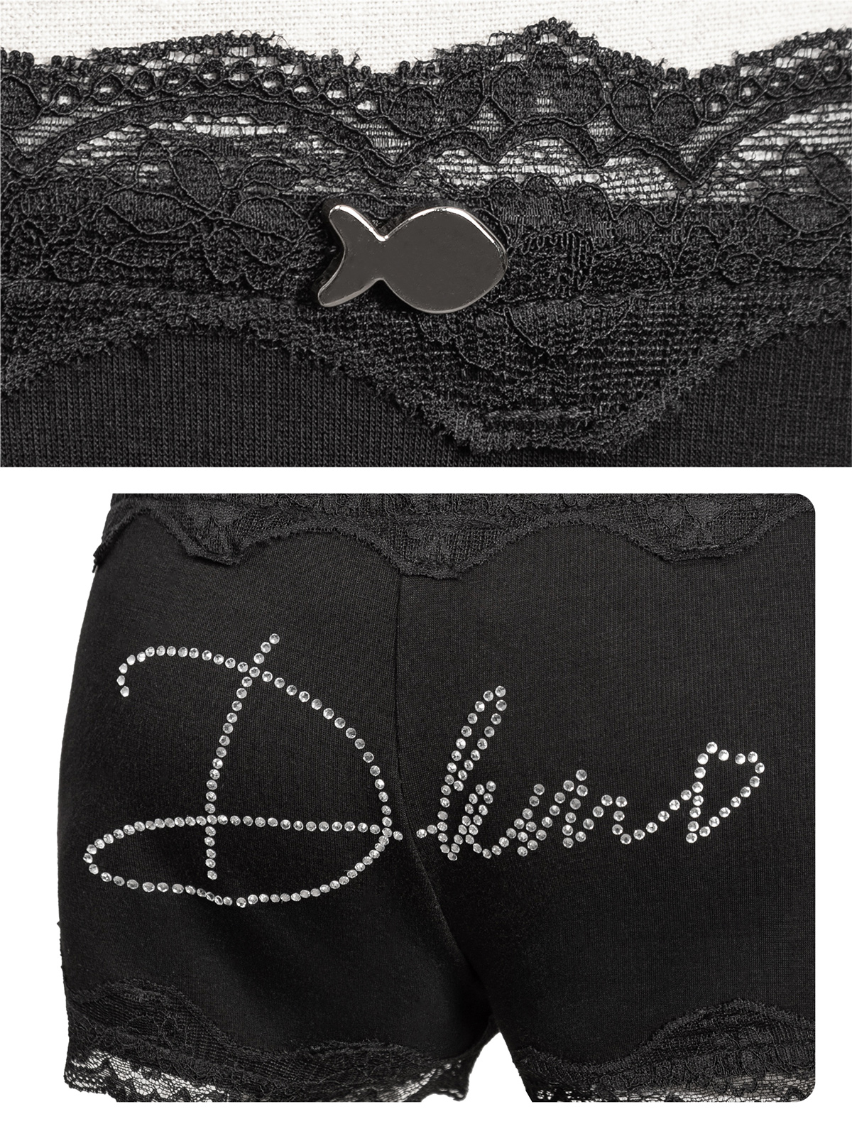 Sự kiêu kỳ còn được thể hiện qua họa tiết đính cườm nhỏ nhắn, lấp lánh xinh yêu trên thân quần, mang lại vẻ ngoài đáng yêu ngay cả khi không lộ ra ngoài. Chi tiết đính logo cá inox nhỏ nhắn hoàn thiện dấu ấn thương hiệu DKMV một cách tinh nghịch.