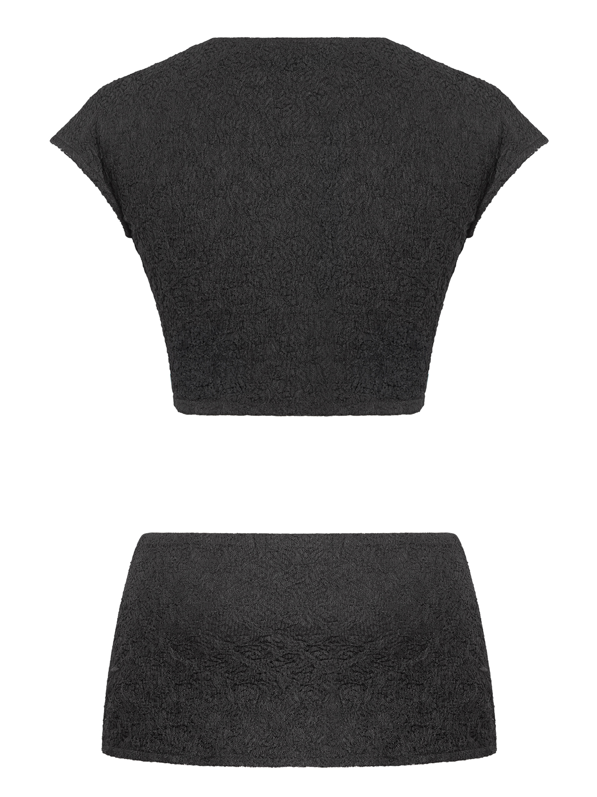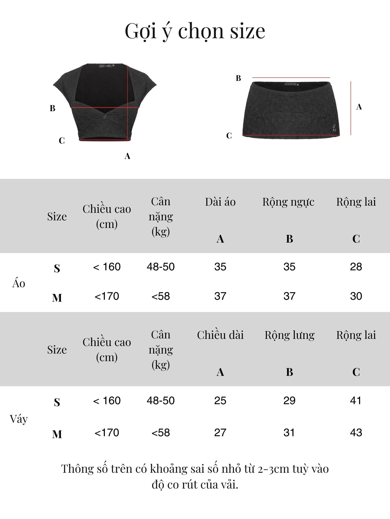 Set đồ bao gồm áo có thiết kế croptop dáng ngắn, cúp ngực tinh tế, ngắn tay, vừa khoe khéo bờ vai vừa giúp kéo dài tỷ lệ cơ thể. Kiểu dáng ôm body quyến rũ của áo và váy tạo nên sự đồng điệu, giúp người mặc dễ dàng nổi bật giữa đám đông, phô diễn trọn vẹn sự cuốn hút.